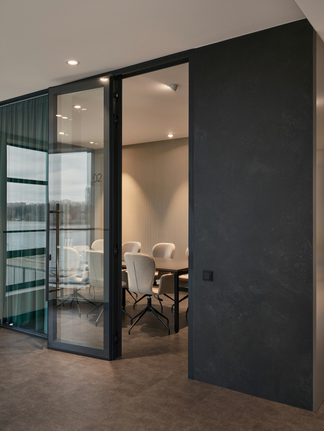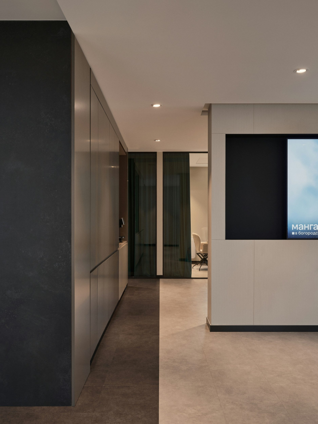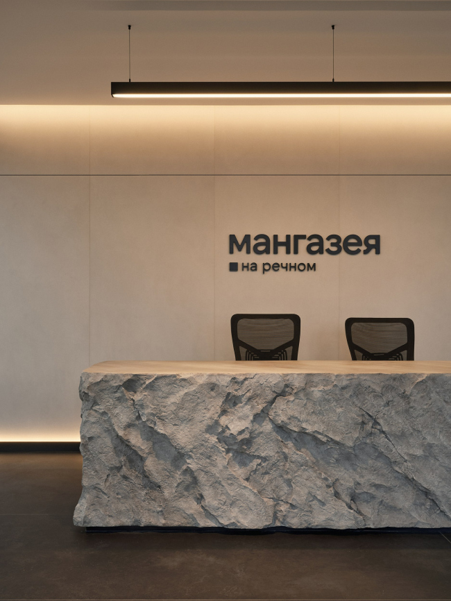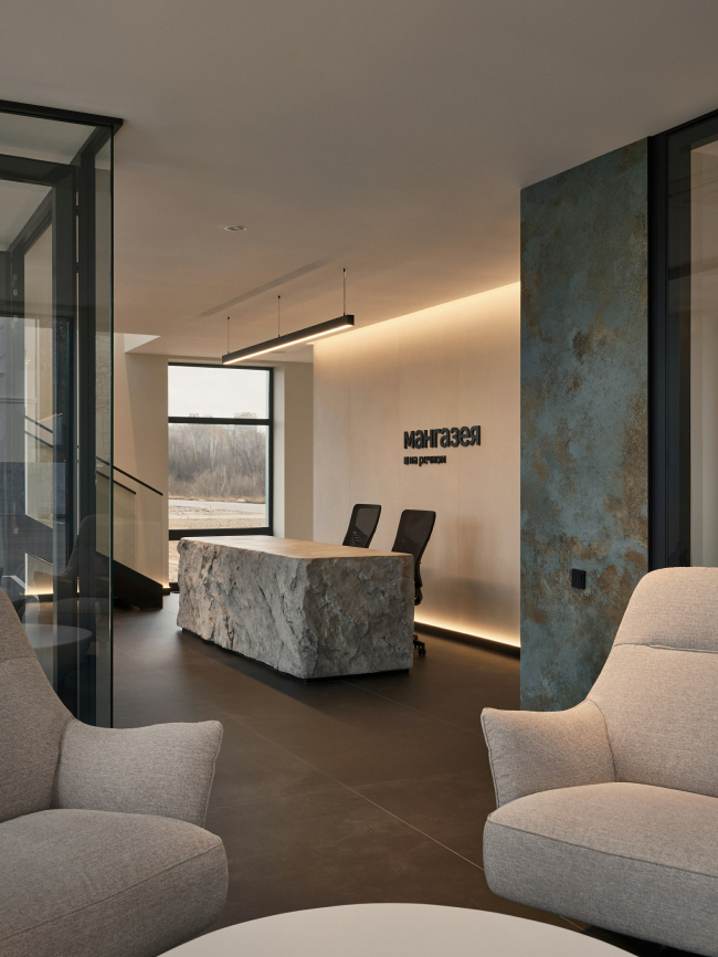 В дизайне интерьеров основу выбора составили приглушенные, мягкие оттенки северной природы. Вдохновением для выбора такой палитры стало спокойное и солнечное северное утро. Доминантой интерьера стала стойка ресепшен: ее выполнили из архбетона по индивидуальному проекту, в форме, имитирующей природный валун. Внутреннее пространство офиса составила комфортная зона презентации проекта и переговорные комнаты.
