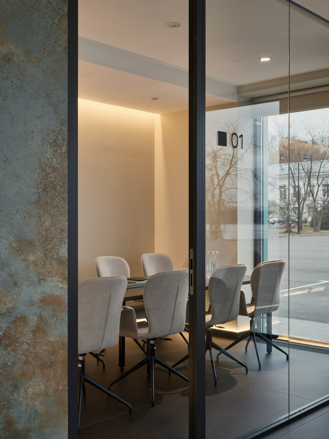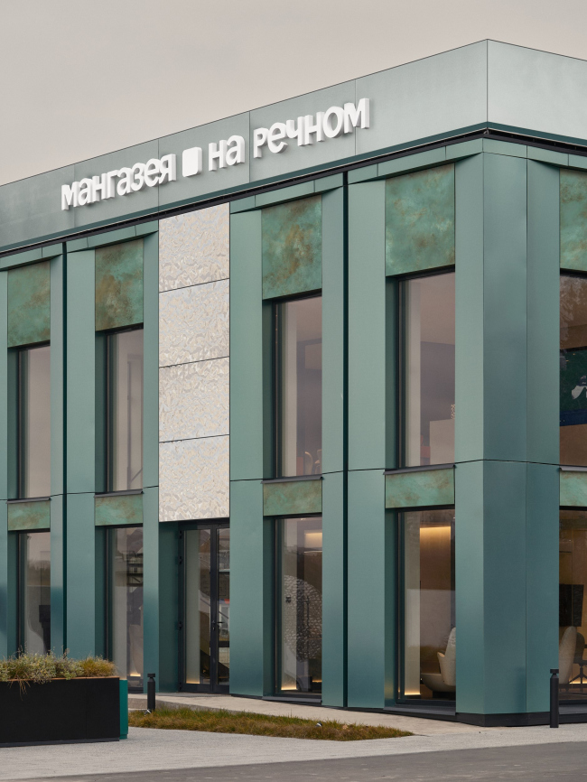«Важную роль в формировании архитектуры офиса продаж для «Мангазеи на Речном» сыграло освещение: благодаря ему объект заметен в вечерние часы и приобретает особенную геометрию. Фасады разделены вертикальными линиями со встроенной подсветкой в теплых тонах, что визуально выигрышно вытягивает здание по высоте. На уровне верхнего ограждения мы предусмотрели рассеянную архитектурную подсветку, а зону с металлом, имитирующим водную рябь, подсветили прожекторами с уровня земли. Таким образом удалось подчеркнуть рельеф и игру света во входной группе», – поделился партнер и главный архитектор бюро MORS ARCHITECTS Дмитрий Макеенко.
