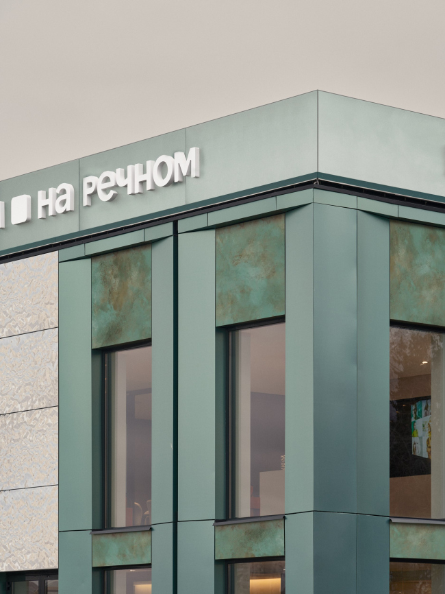 В основе концепции офиса продаж – образ спокойных речных вод, перекликающийся с концептуальным решением всего жилого проекта. В качестве основного материала были выбраны фасадные панели двух типов – моноцветные и с рисунком состаренной меди. Их дополнили металлическими вставками.