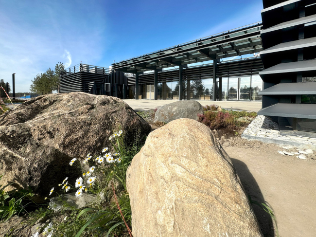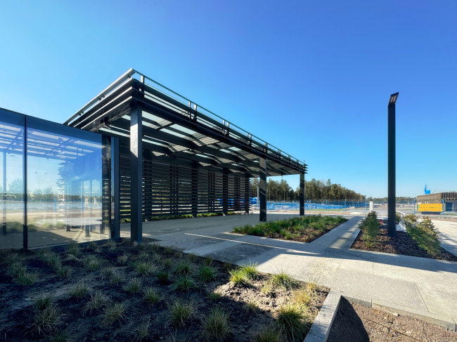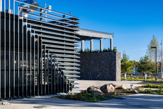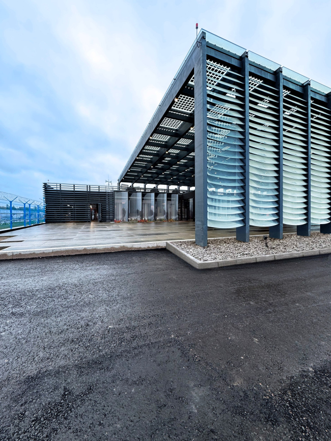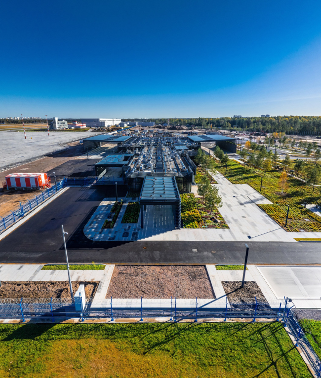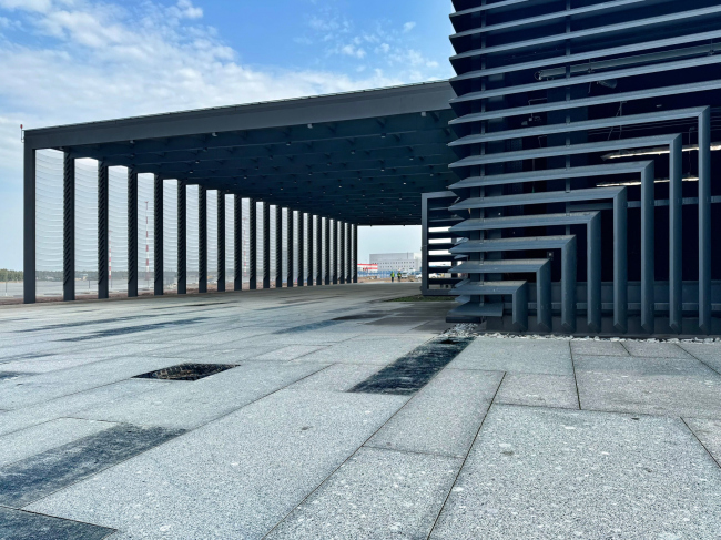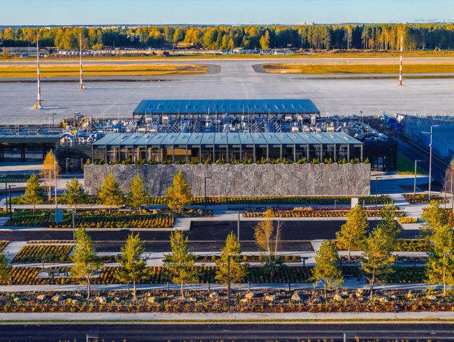 Аэровокзал «Левашово» раскрывает характер и красоту северной природы: камень из местных карьеров, элементы благоустройства и сосны на гранитной стене. Массивный и монументальный южный фасад из каменных слябов и «легкий» северный фасад из ламелей полукруглого просветленного стекла (ветрозащита со стороны перрона) символизируют «землю» и «небо».