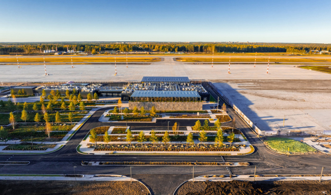 Генеральный план комплекса на аэродроме «Левашово» предлагает новый, гармоничный язык общения людей с архитектурным пространством и окружающей средой. Динамичный и одновременно успокаивающий образ достигается за счет инновационной композиции природно-паркового комплекса. Фасады здания, выполненные из стекла с зеркальным эффектом, будто растворяются в окружающих соснах и кустарниках, отражая их и создавая эффект умножения.