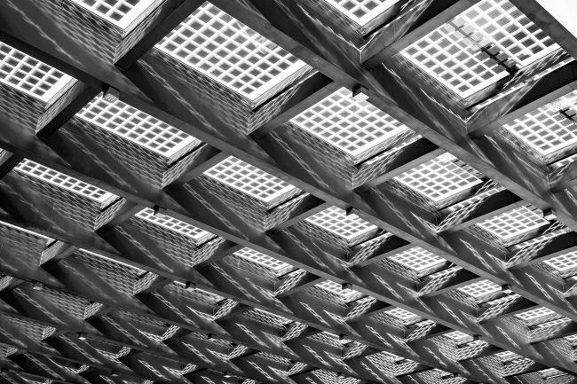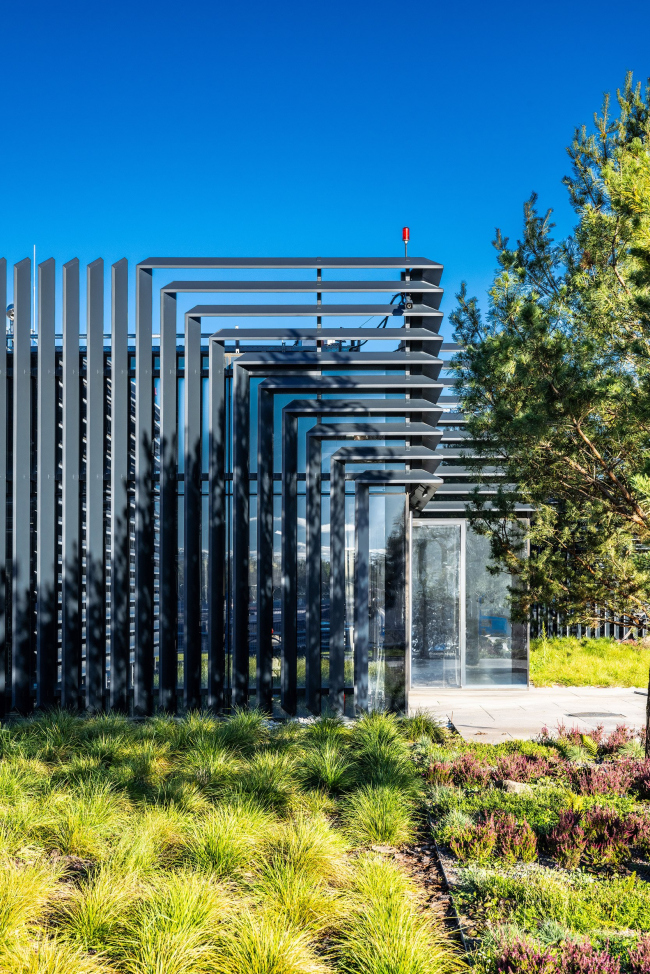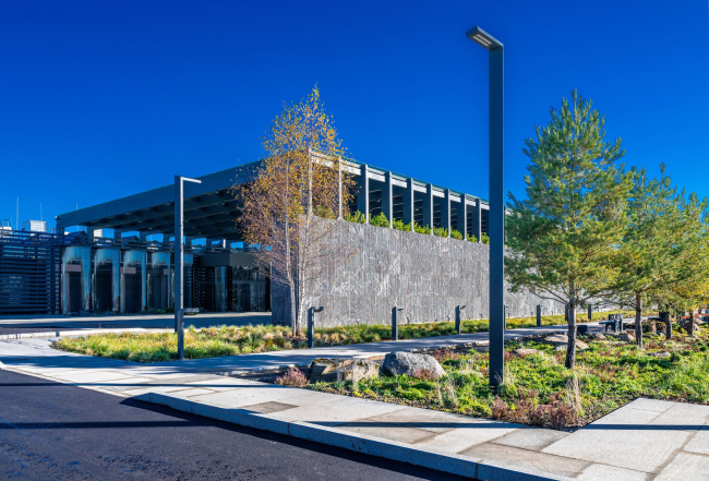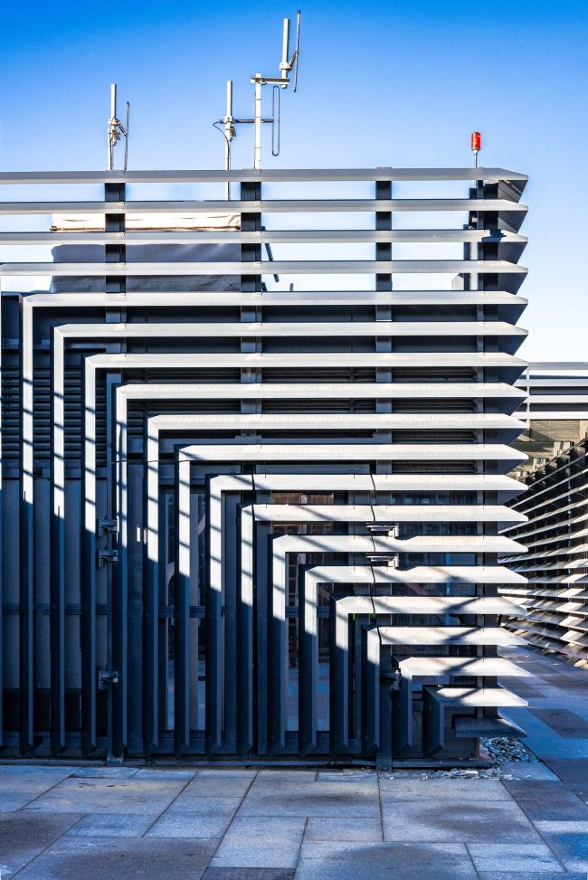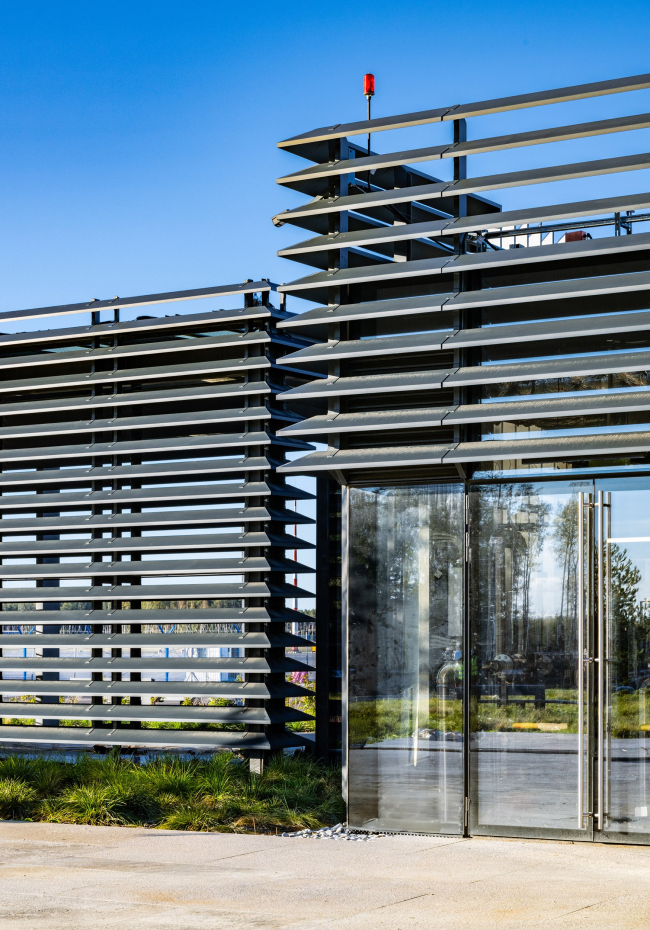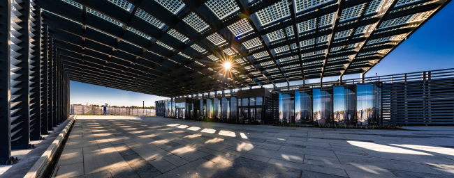 Фасады выполнены из структурного остекления с применением наружных ламелей: горизонтальных – с южной стороны, защищающих от «высокого» солнца, и вертикальных – на западе и востоке, предотвращающих перегрев от «низкого» солнца. Ламели установлены в соответствии с расчетами экранирования солнечной энергии. Это решение позволяет более эффективно (и экономично) охлаждать здание.