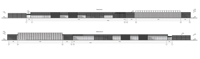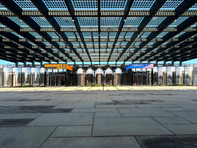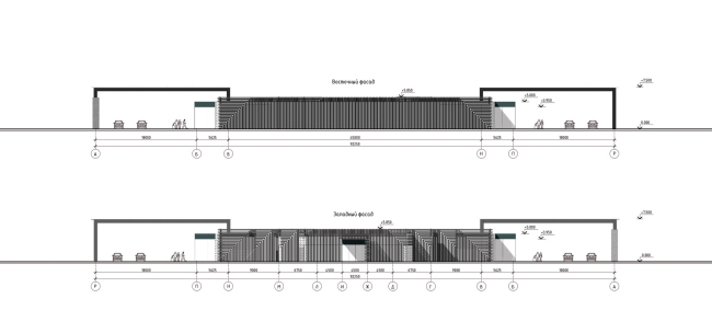 Моллированные стеклопакеты на северном и южном фасадах оформляют входные группы с медиаэкранами. Входные группы защищены от осадков и прямых солнечных лучей светопрозрачными навесами: с южной и северной сторон, с пролетом почти 25 м и общей площадью 2300 кв. м. Покрытия навесов выполнены из триплекса с встроенными фотоэлементами (монокристаллический кремний) и автоматизированной системой снеготаяния.