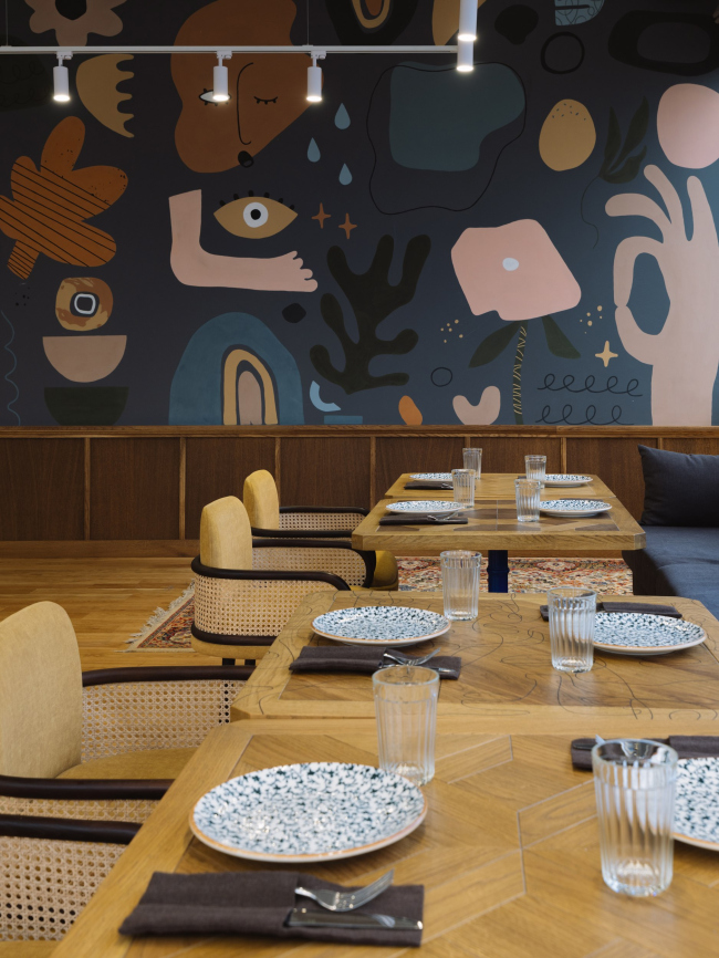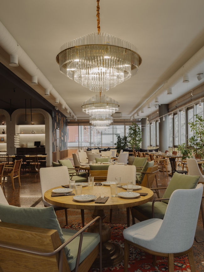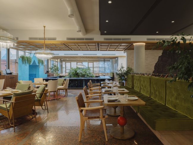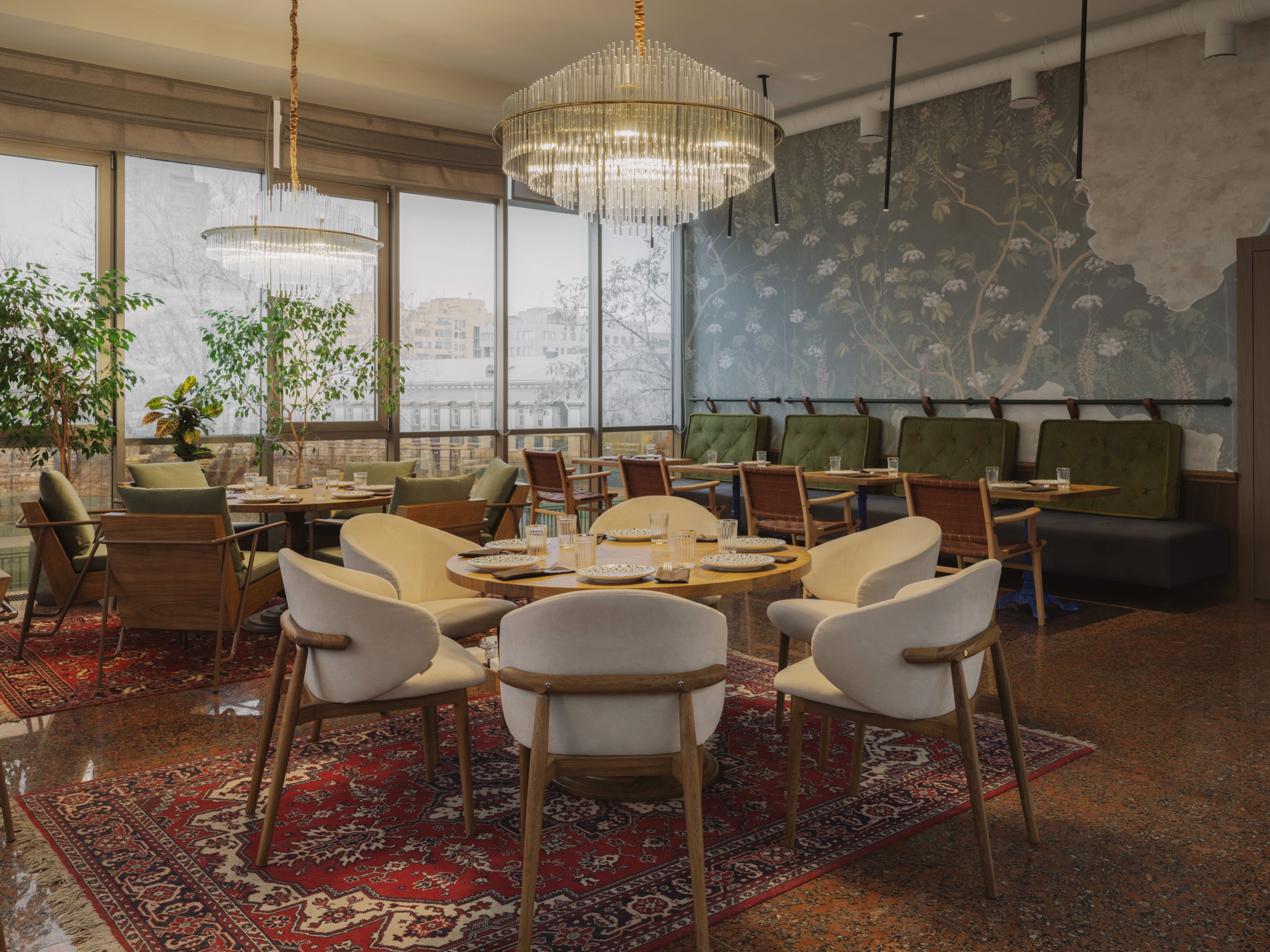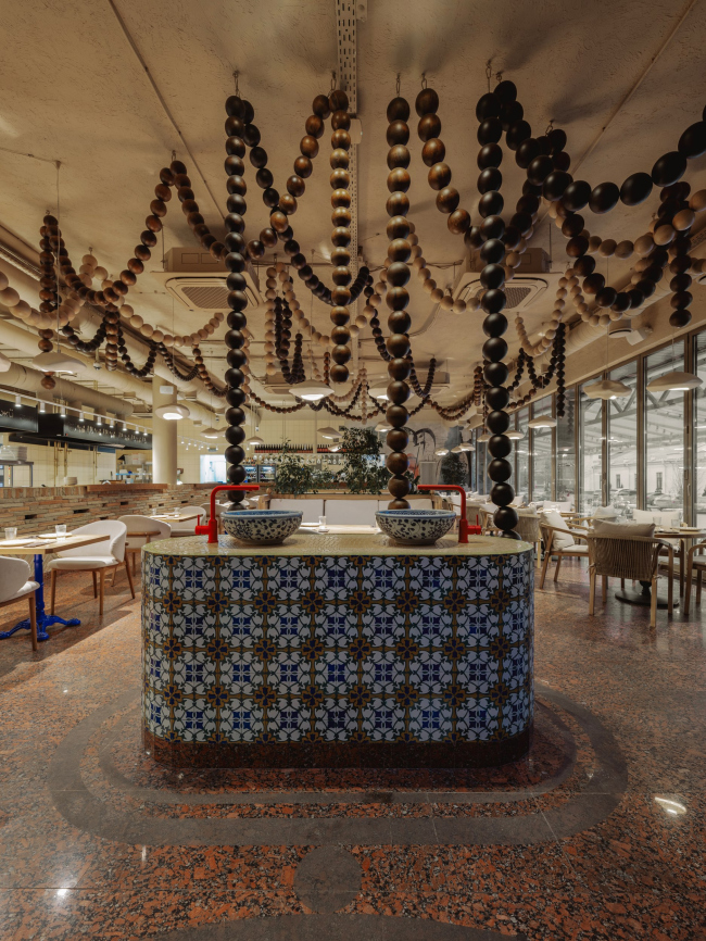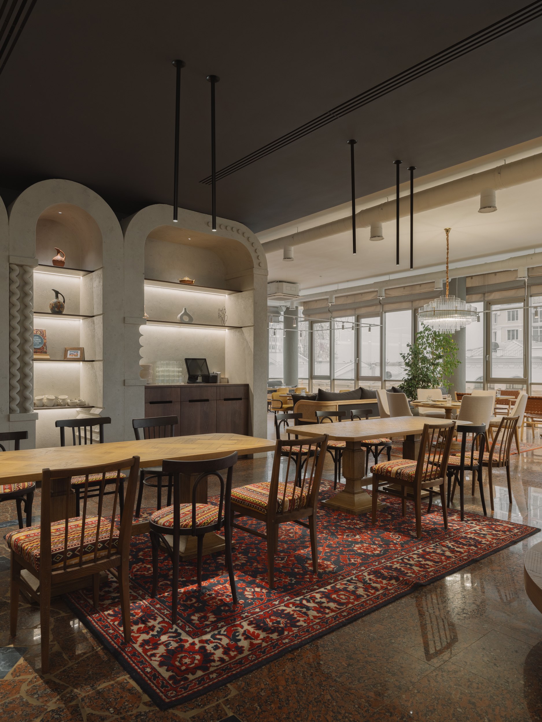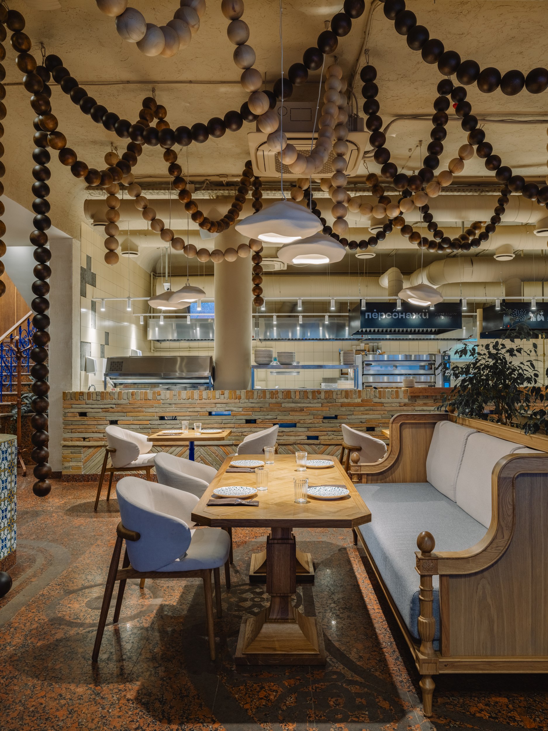 Резные узорчатые столы ручной работы символизируют баланс прошлого и настоящего. Мебель из натурального дерева повторяет природные мотивы и поддерживает экологичный подход в дизайне. Разнообразие посадочных мест позволяет проводить время как в большой компании, так и вдвоём.
