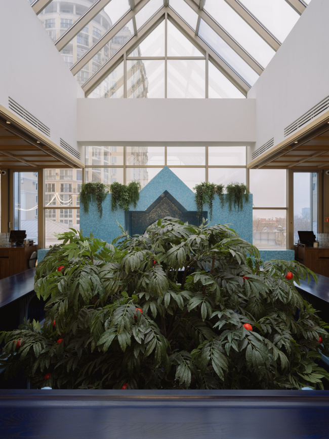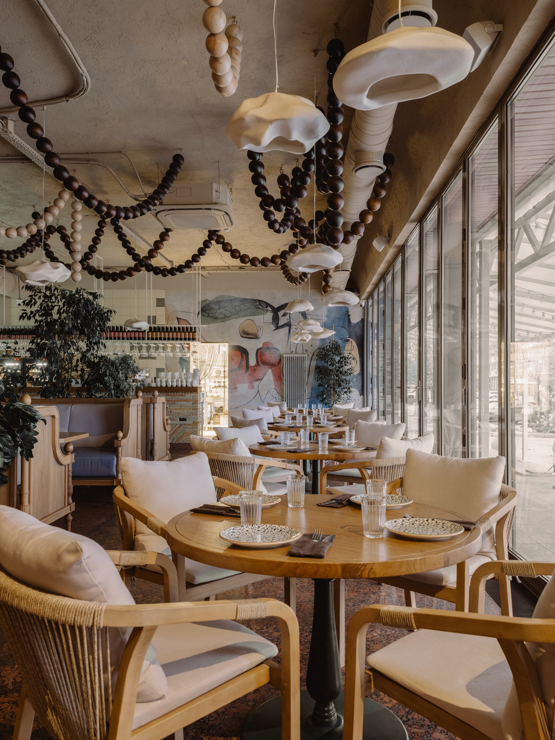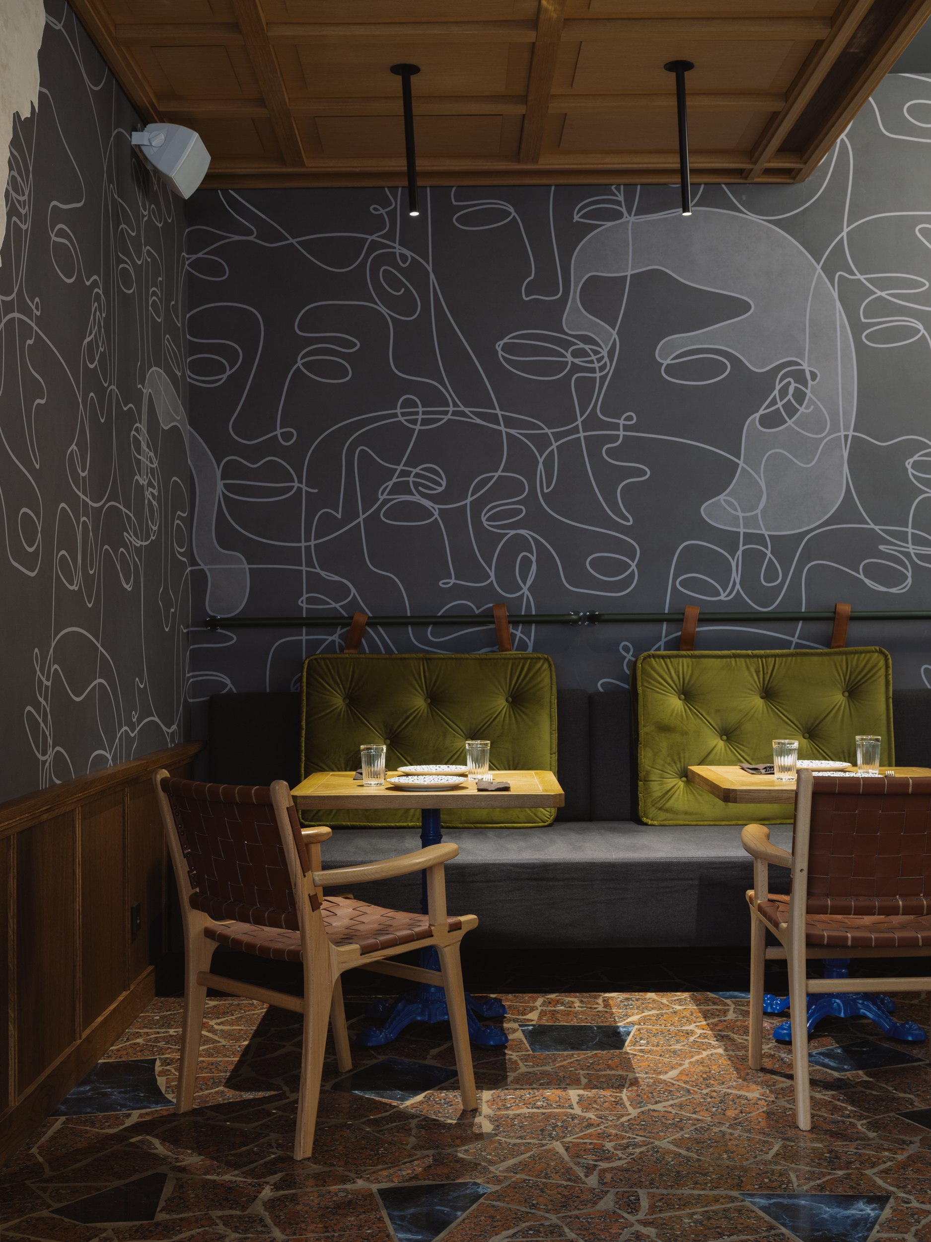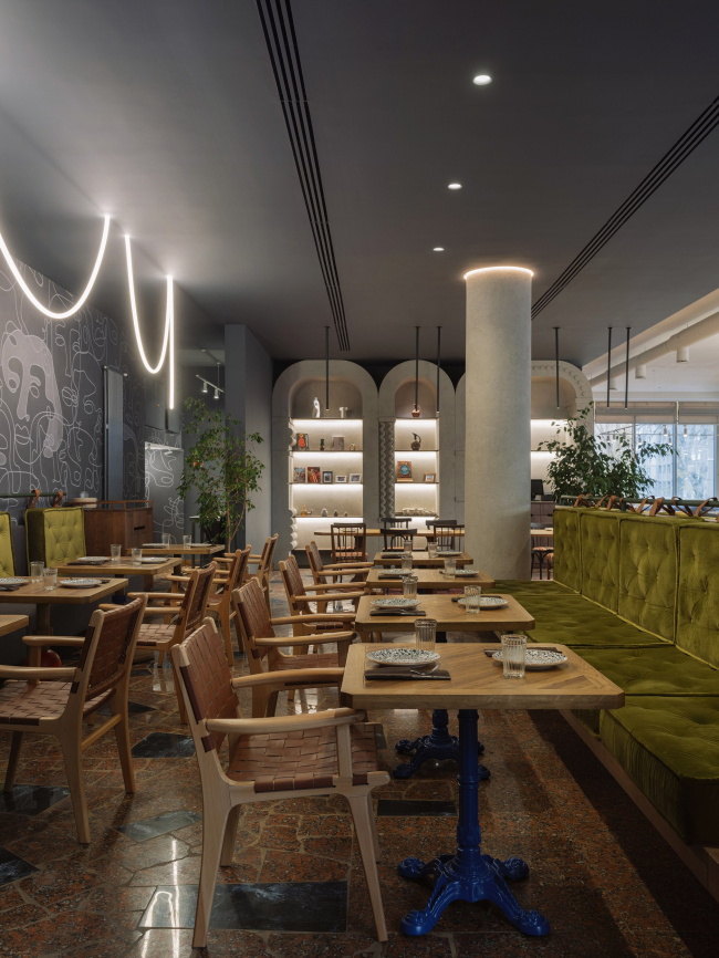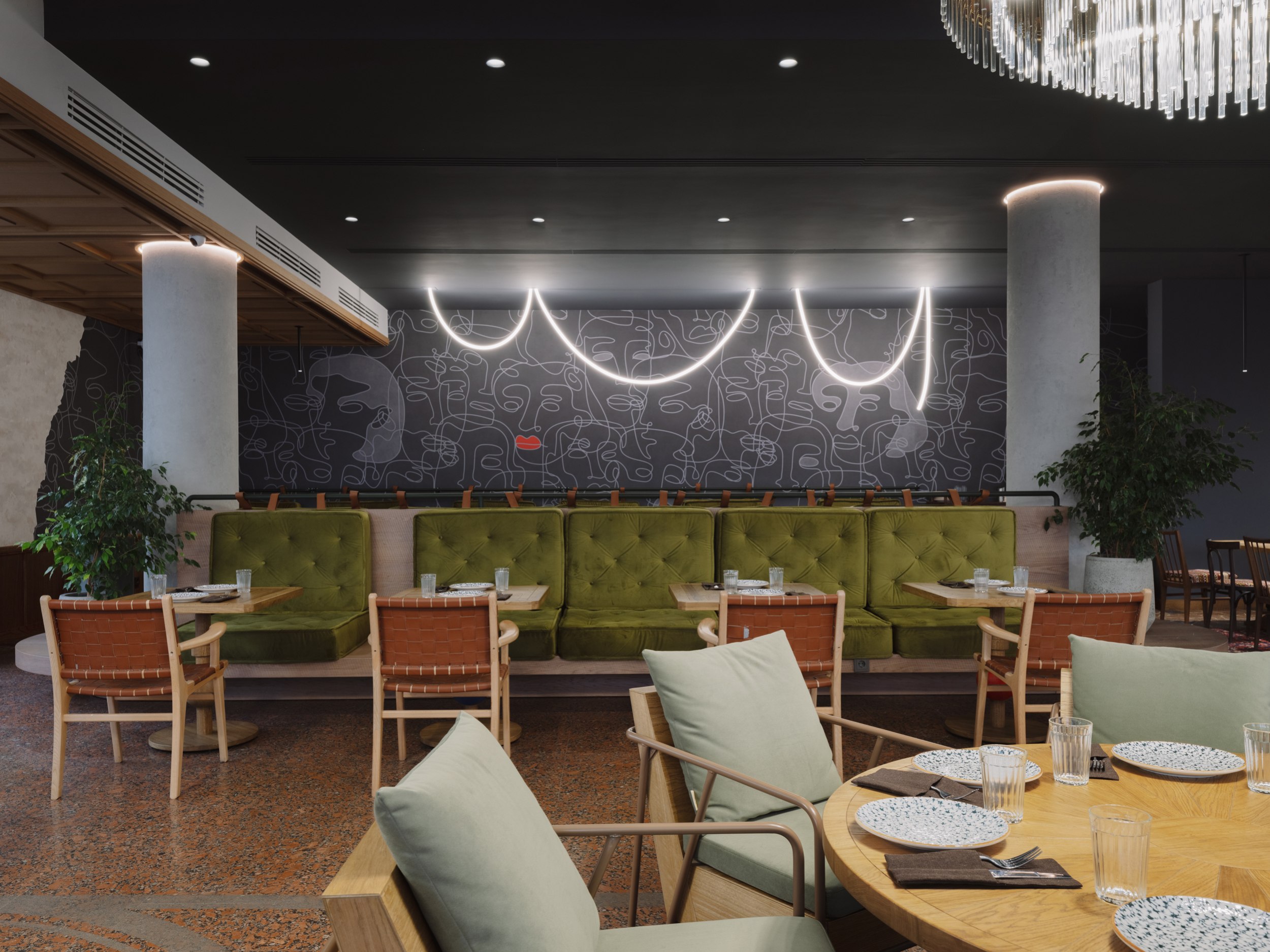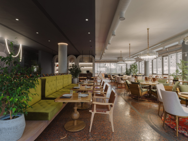 Резные узорчатые столы ручной работы символизируют баланс прошлого и настоящего. Мебель из натурального дерева повторяет природные мотивы и поддерживает экологичный подход в дизайне. Разнообразие посадочных мест позволяет проводить время как в большой компании, так и вдвоём.