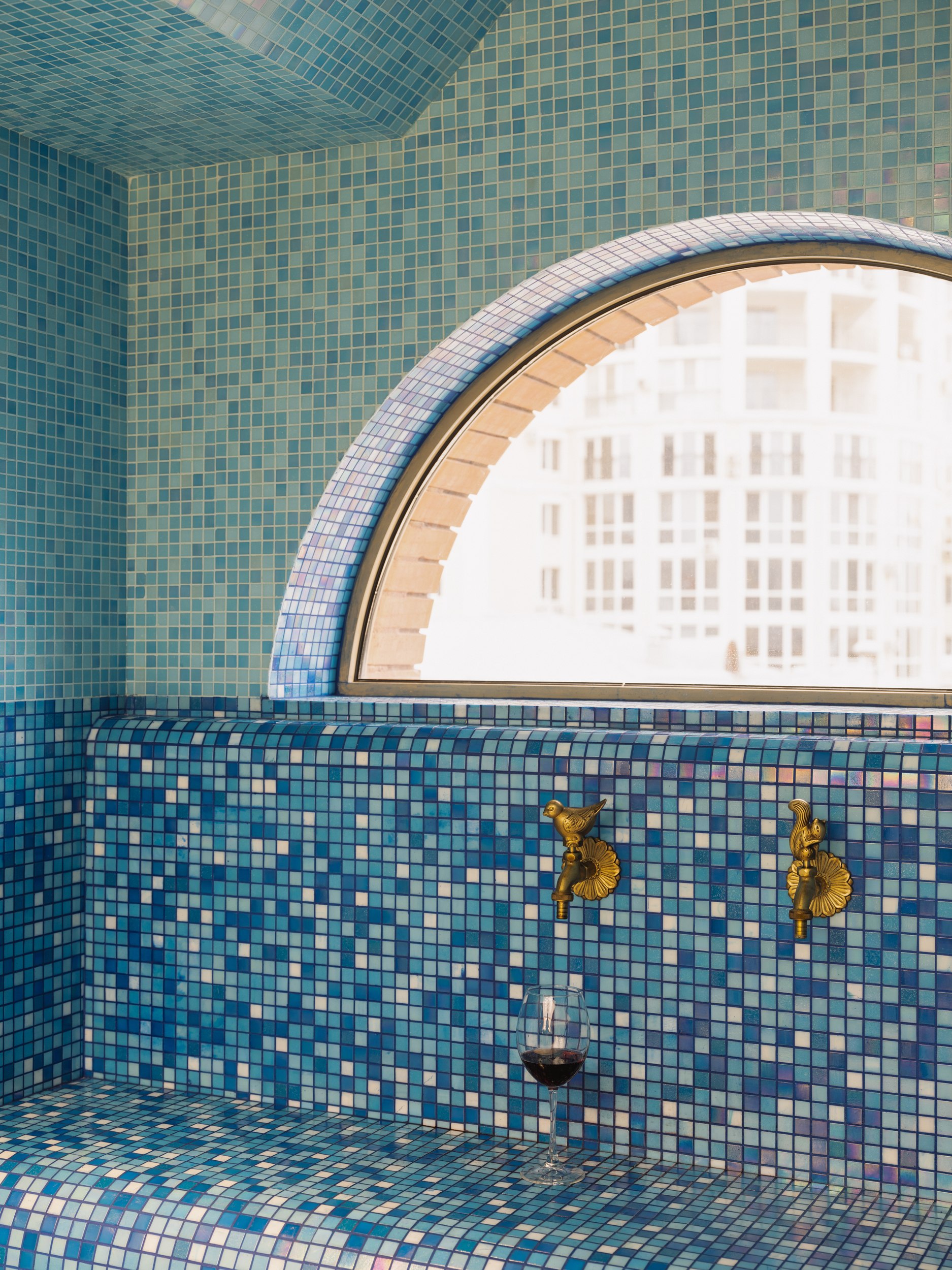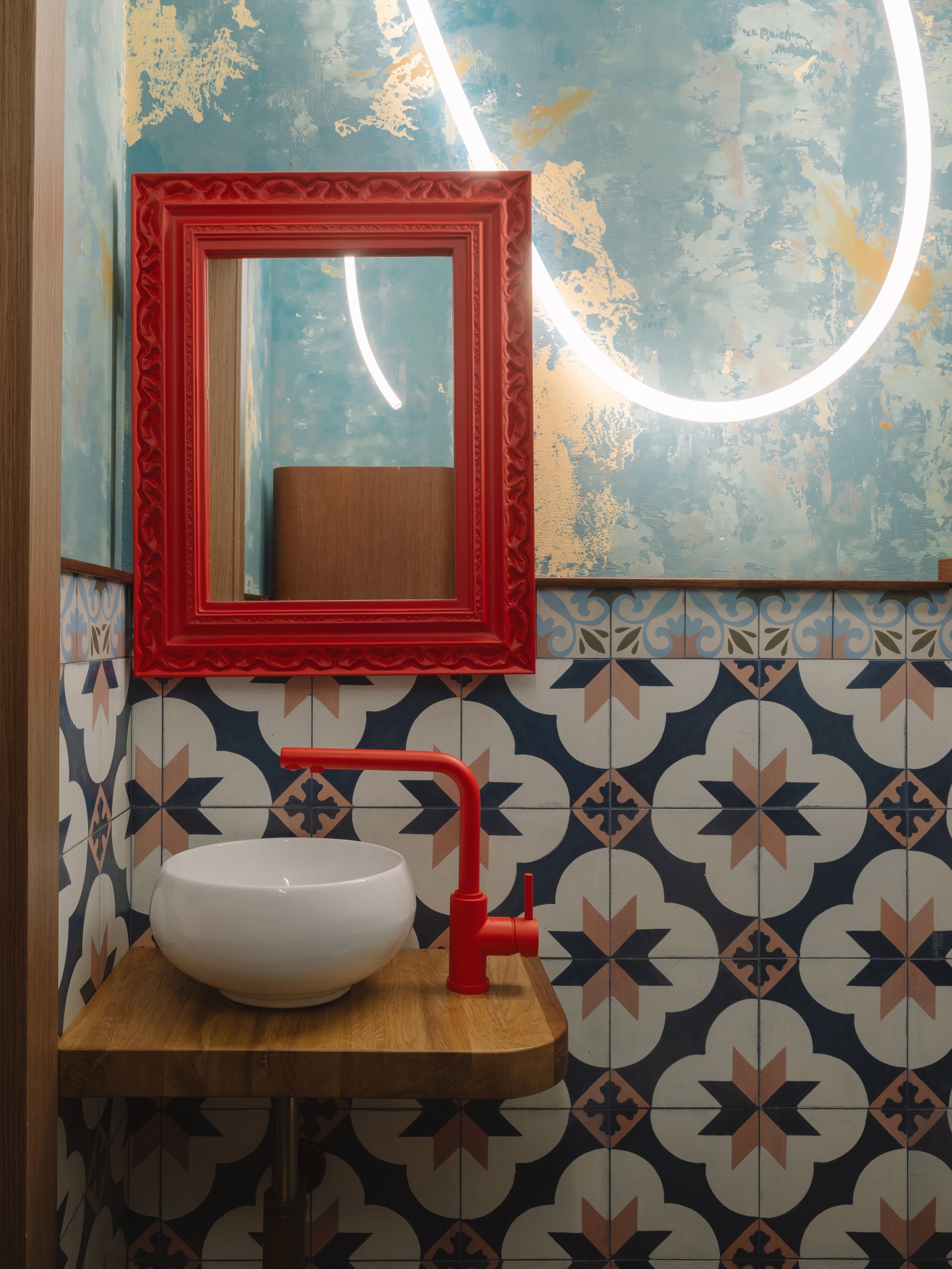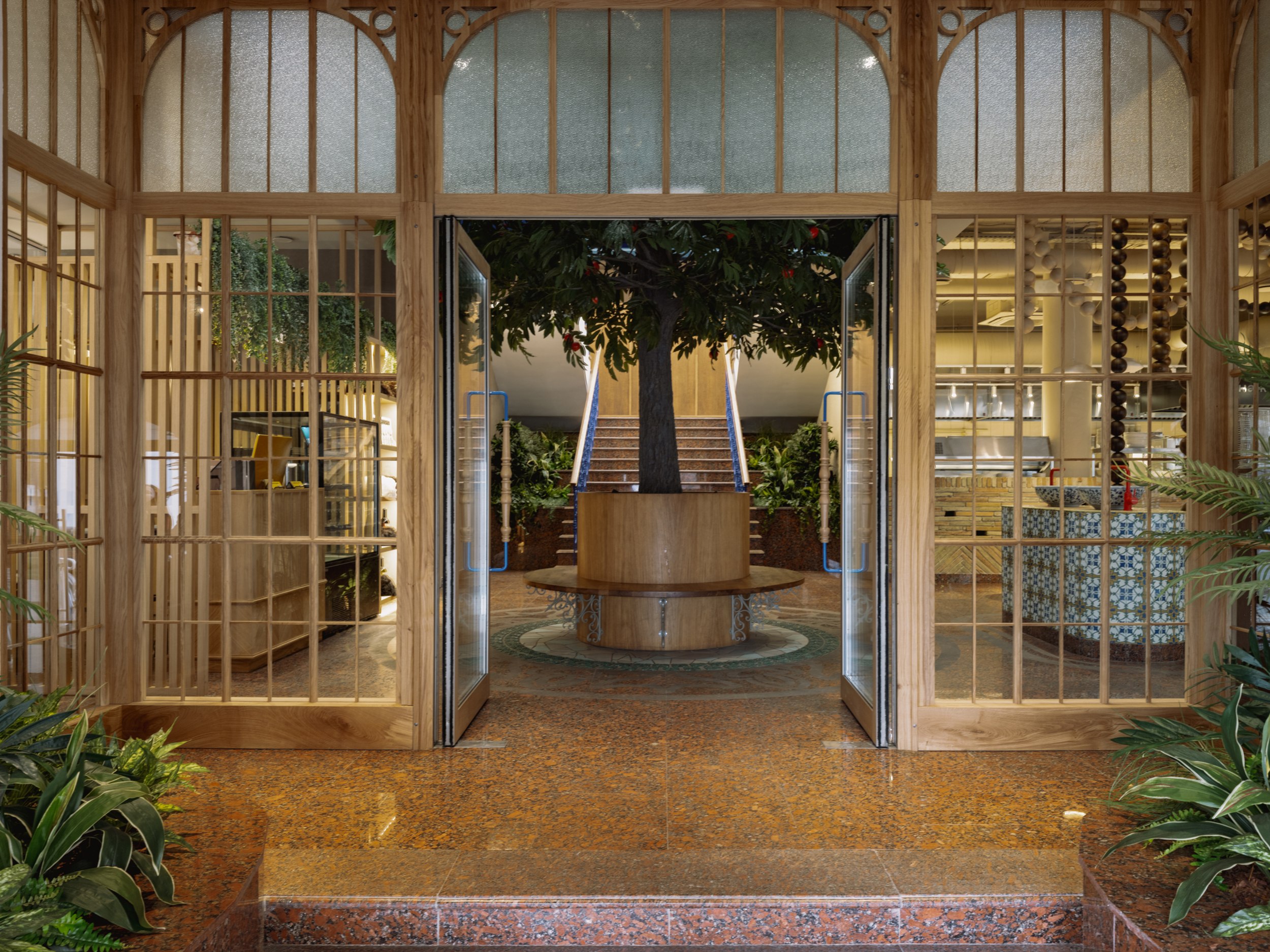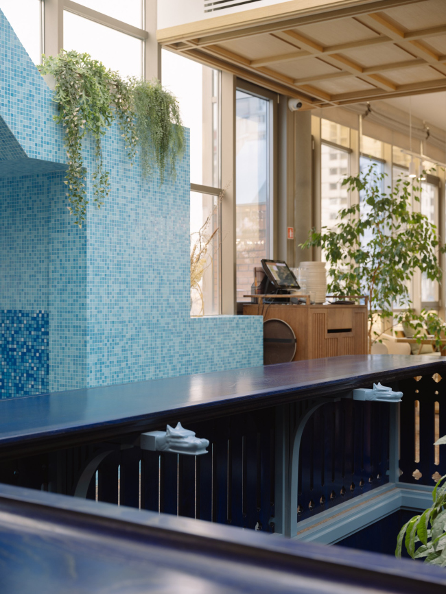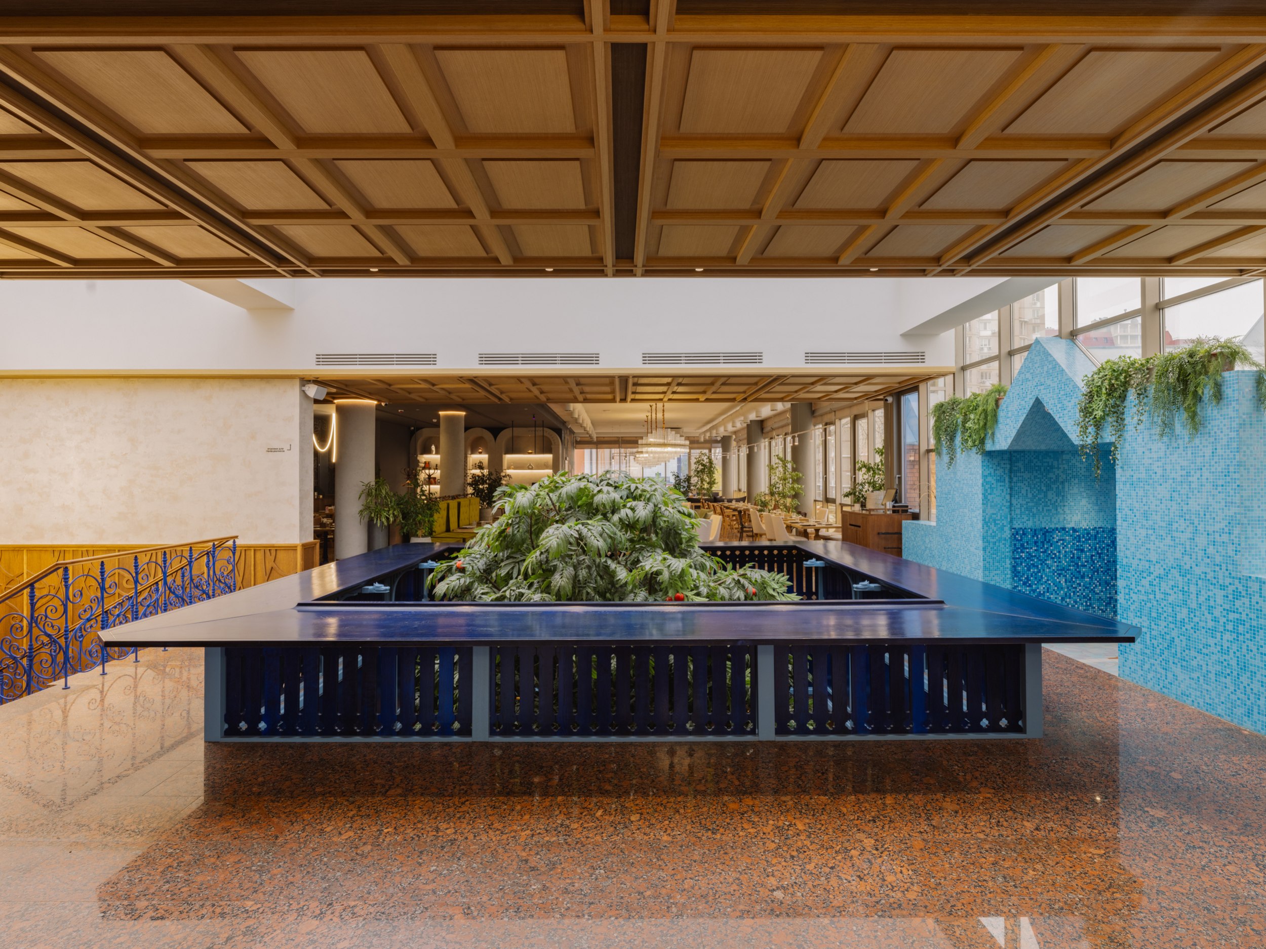 Резные узорчатые столы ручной работы символизируют баланс прошлого и настоящего. Мебель из натурального дерева повторяет природные мотивы и поддерживает экологичный подход в дизайне. Разнообразие посадочных мест позволяет проводить время как в большой компании, так и вдвоём.