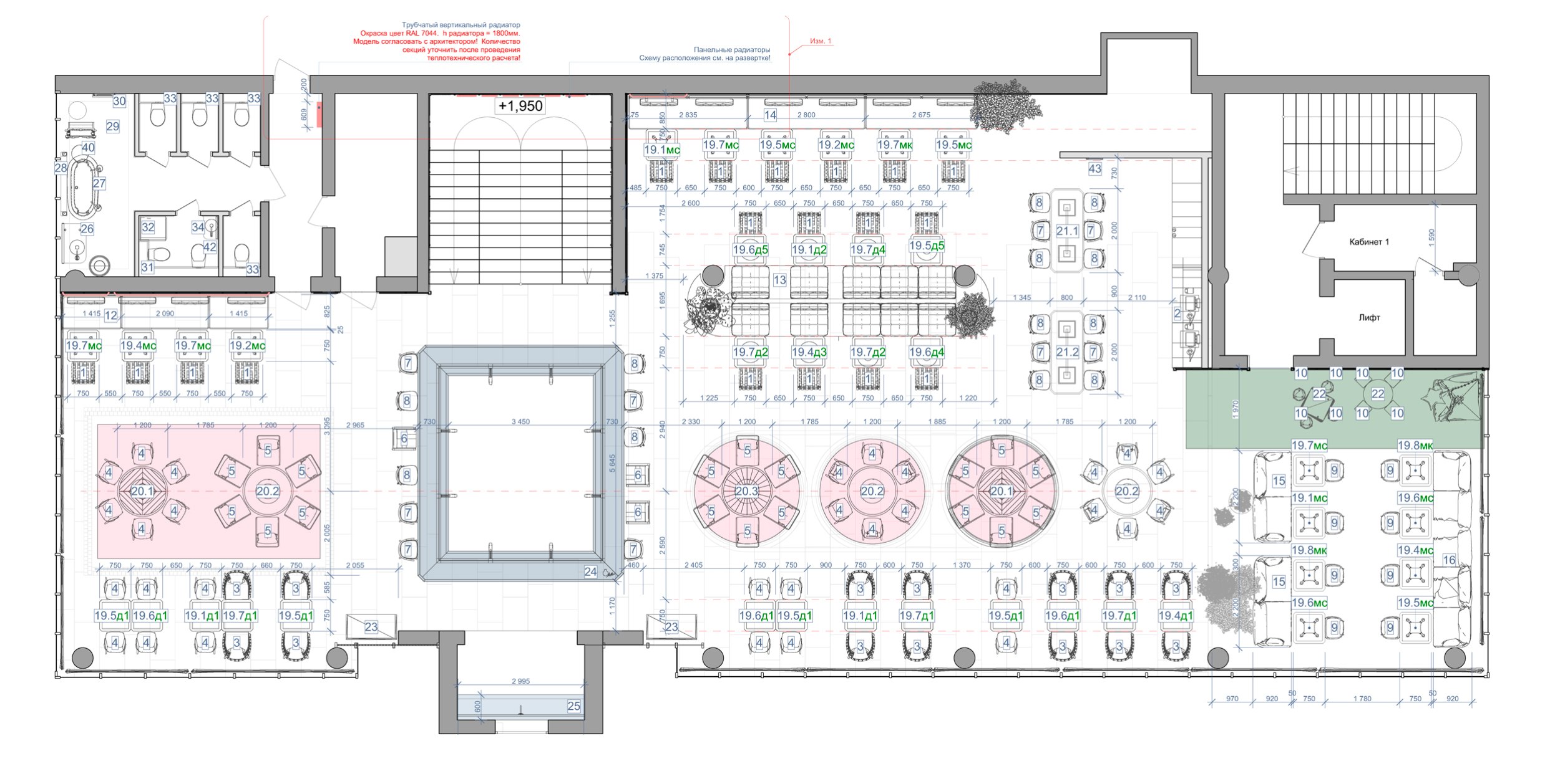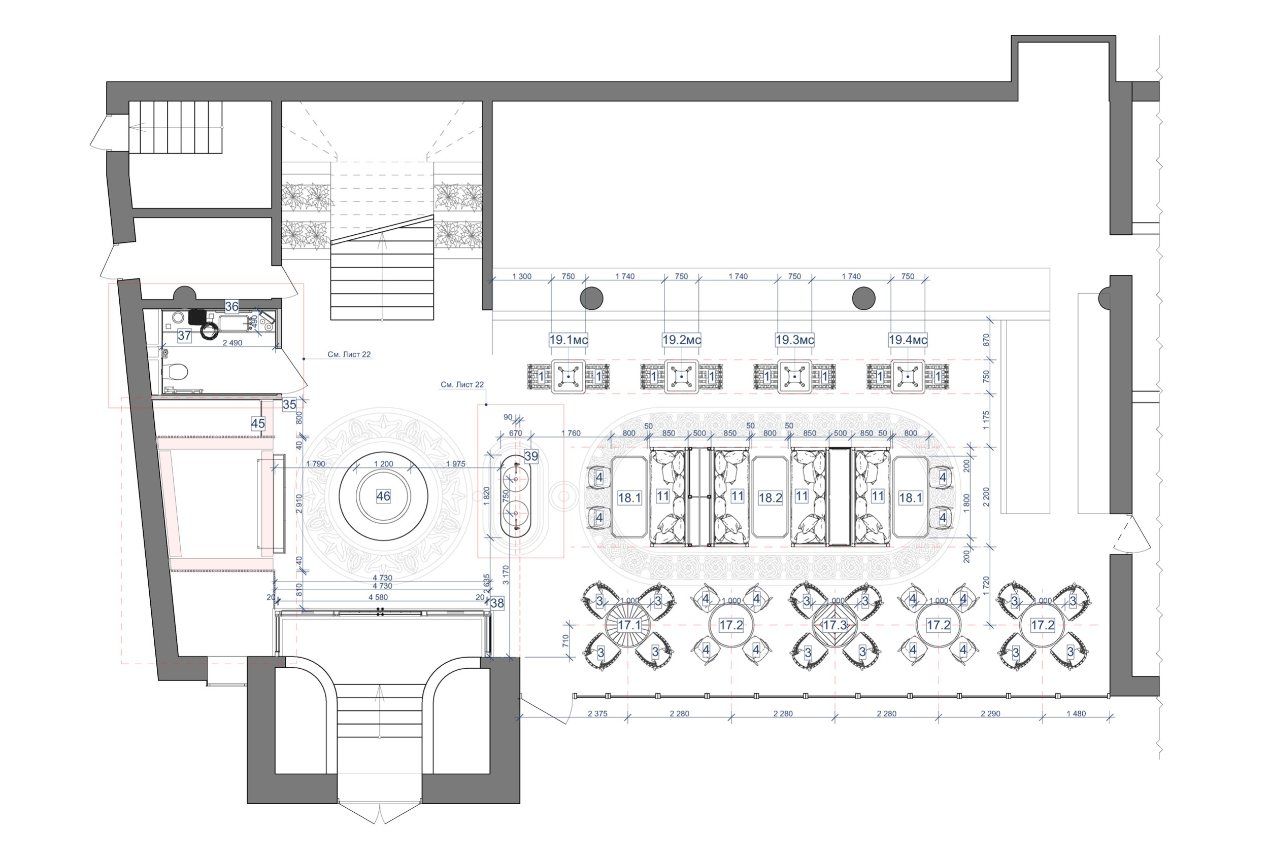 Существующий гранитный пол стал основой для создания уникальных грузинских узоров, придающих залу индивидуальность. Лишь часть покрытия демонтировали и использовали в оформлении других зон, что сохранило гармонию и целостность интерьера.