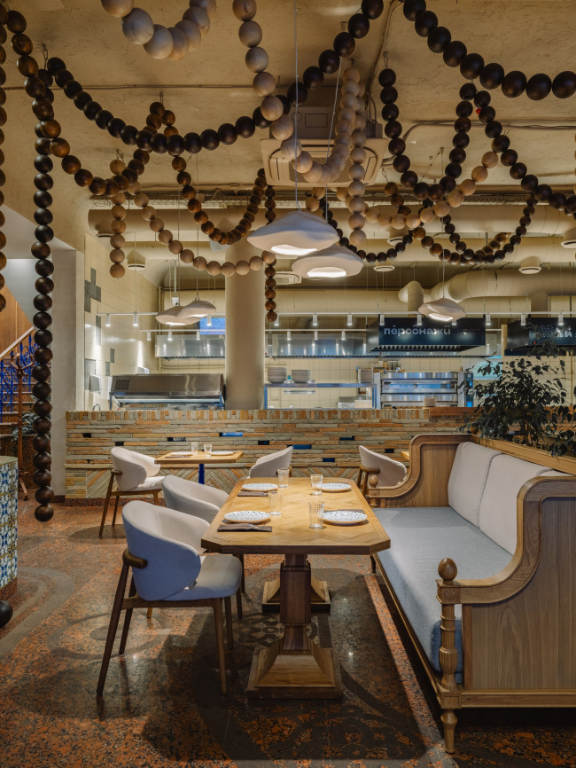 Внимание посетителей сразу приковывают подвешенные к потолку большие деревянные бусы. Они напоминают связки чурчхелы или мешочки со специями на рынке или на кухне дома. Эти элементы передают местный колорит и создают праздничное настроение, так характерное для Грузии.