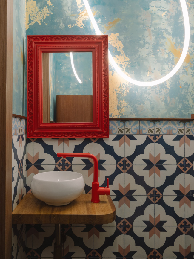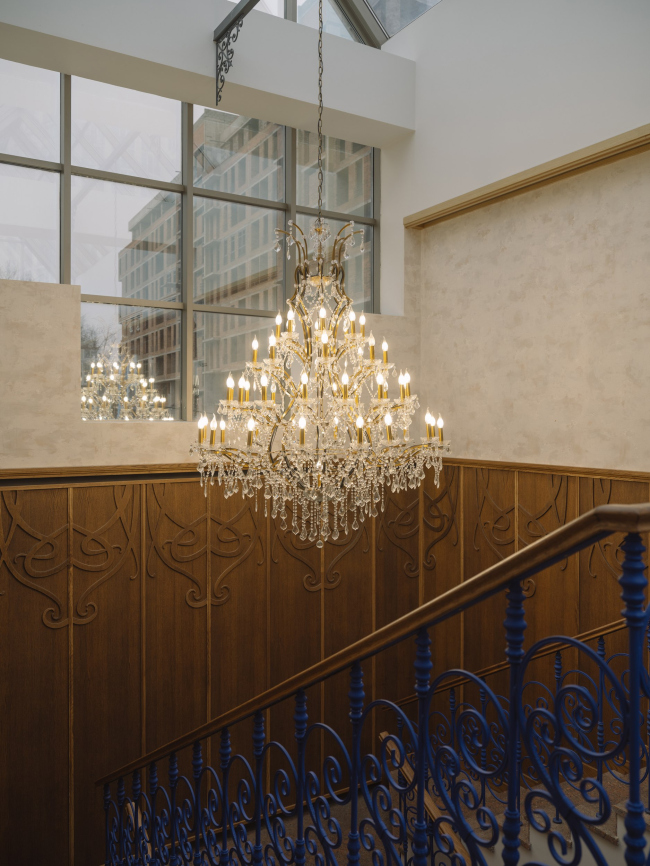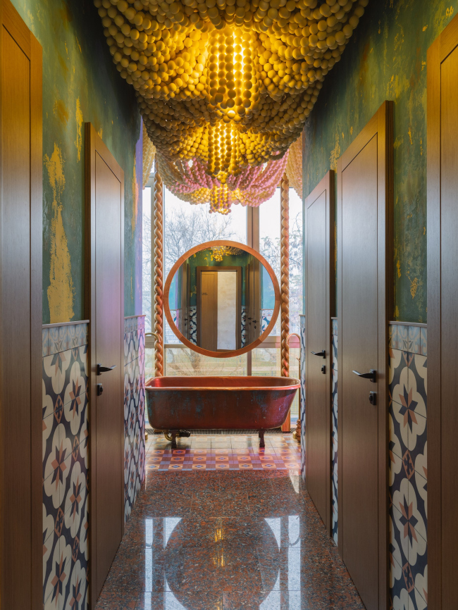 Лестница с яркими коваными ограждениями ручной работы переносит нас в парадную гостиную особняка на втором этаже. Современная стилизация этнических мотивов с добавлением намеренно состаренных элементов подчёркивает связь времён в интерьере. Пёстрые ковры, подушки и массивные люстры придают залу торжественность, характерную для светских вечеров.