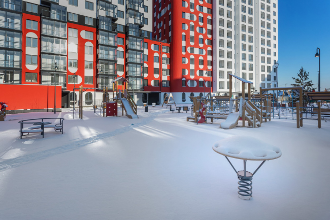 ЖК имеет достаточно большой двор, расположенный на подземном паркинге. Благоустройство было разработано архитектором Натальей. Для озеленения подобраны выносливые, привычные к нашему климату растения, за которыми легко ухаживать. Детская площадка и другие элементы благоустройства спроектированы специально для этого комплекса и рассчитаны на высокую нагрузку, поскольку мы ожидали, что основными жителями станут семьи с маленькими детьми.