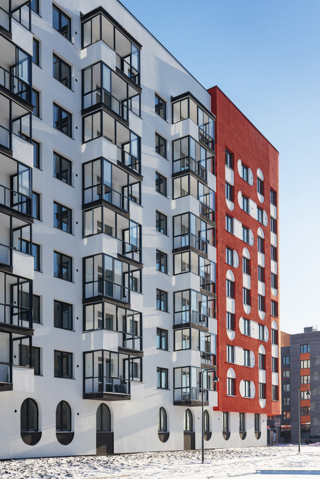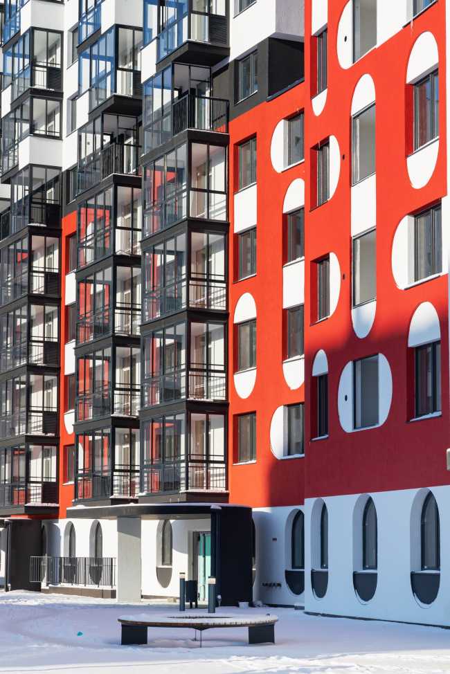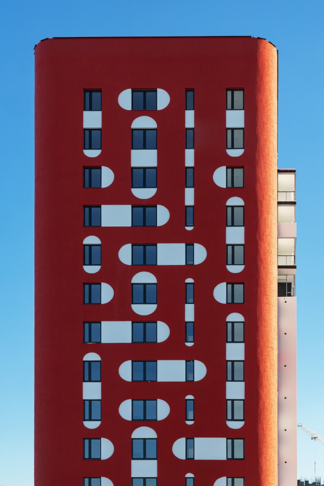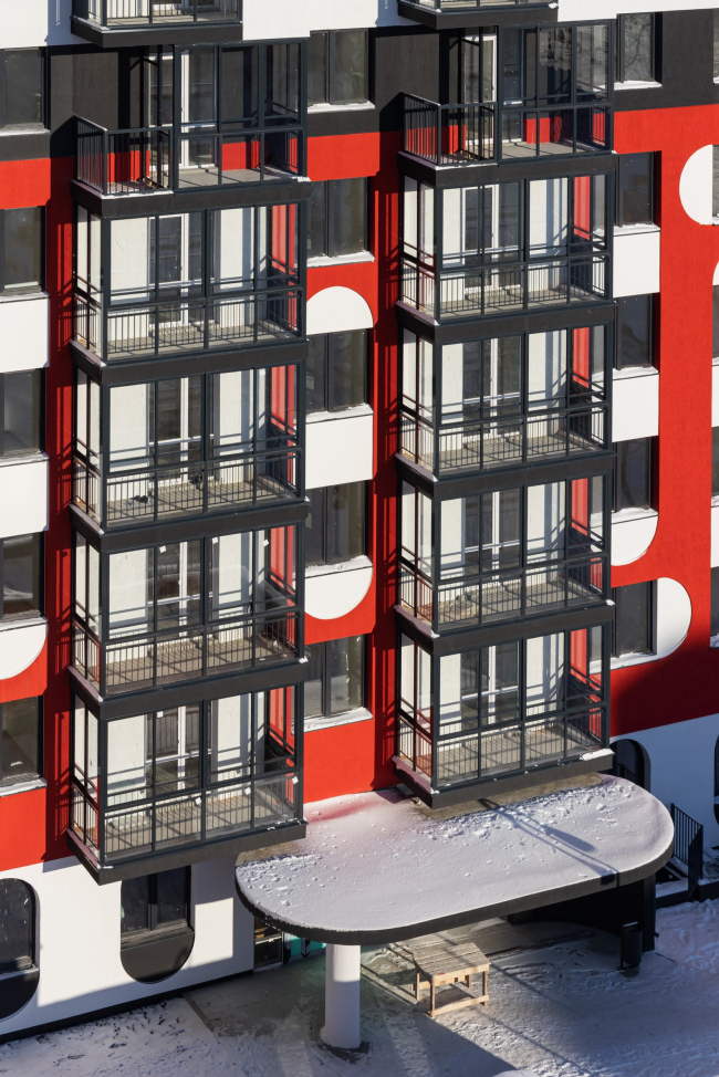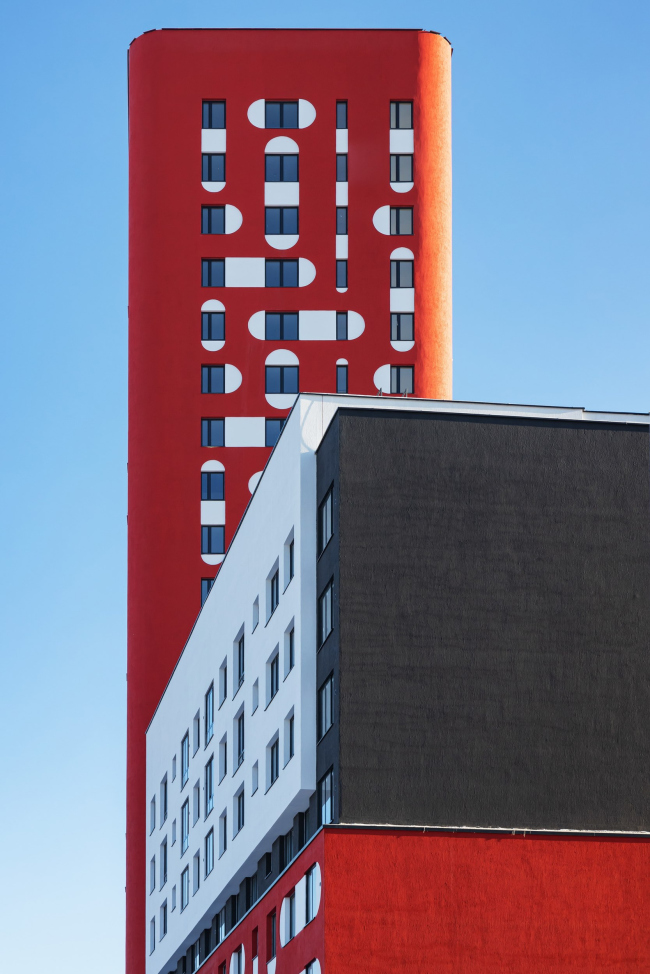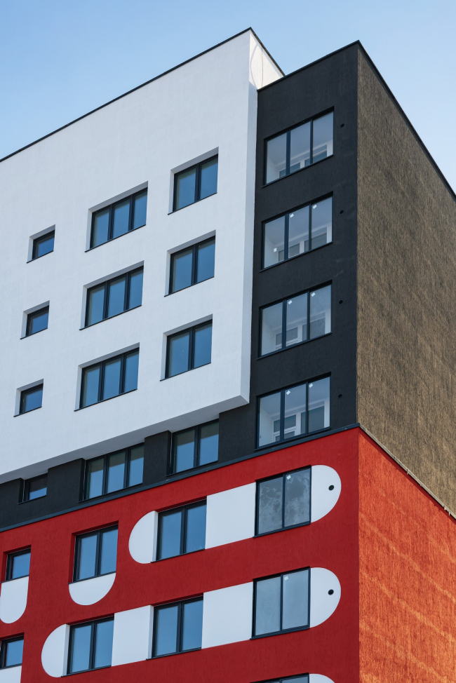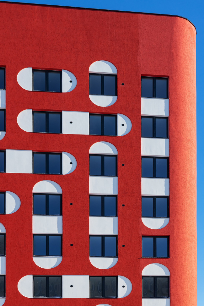 Акцентное решение сформировано сразу тремя приёмами: динамичной композицией объёмов (их заужения и консольные выносы), красным цветом и запоминающимся рисунком фасада. Идея заключалась в создании двухцветного фасада с объединением окон арками по горизонтали и вертикали. Они образуют паттерн, который издалека выглядит цельным, а вблизи его интересно рассматривать, поскольку он состоит из множества мелких деталей. Архитектор Иван Чиков вдохновлялся мотивами мезенской красно-белой росписи. Мы рассматривали два варианта: светлый фасад с тёмными деталями, но остановились на более тёмном фоне со светлыми элементами. Такой подход позволил сохранить целостность объёма, избежав его рассыпания на отдельные элементы. Мы решили сделать фасады красными, чтобы создать яркую, нарядную доминанту. Ещё одной причиной выбора цвета стала его практичность: красный пигмент в штукатурке является самым устойчивым.