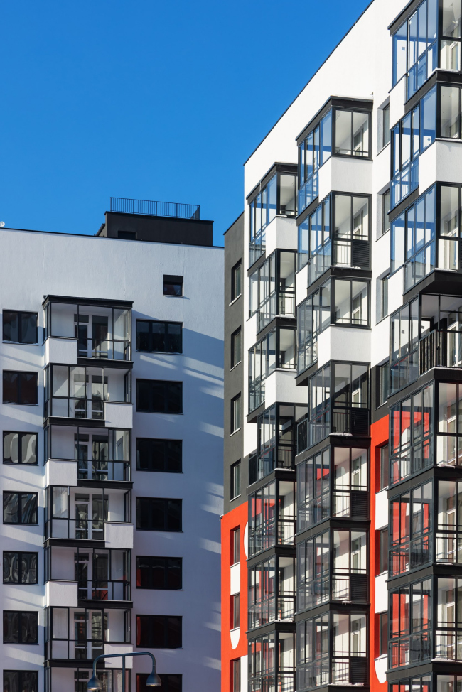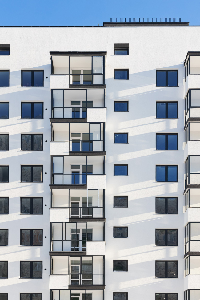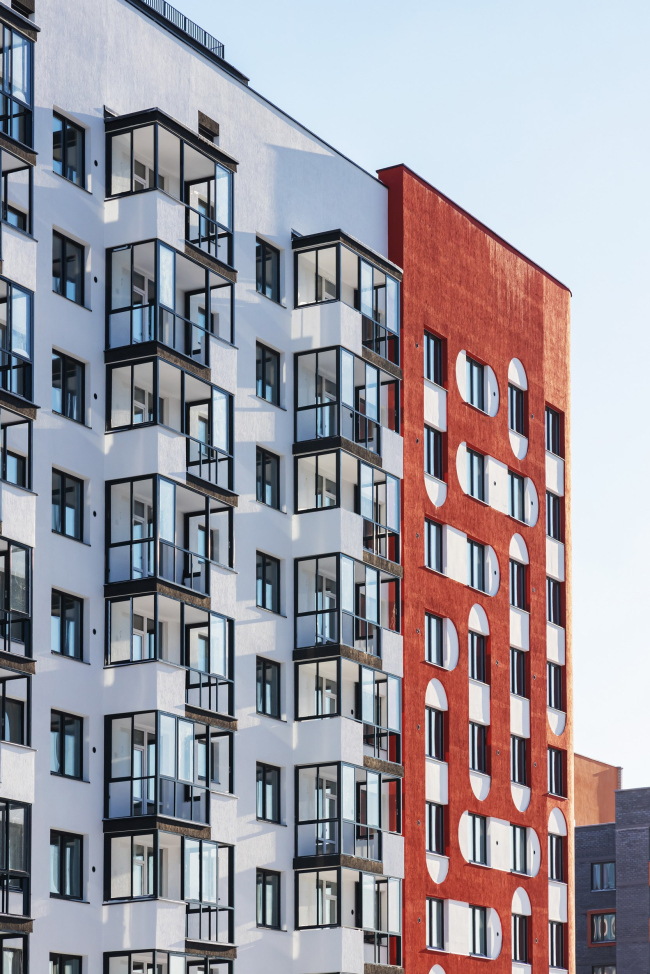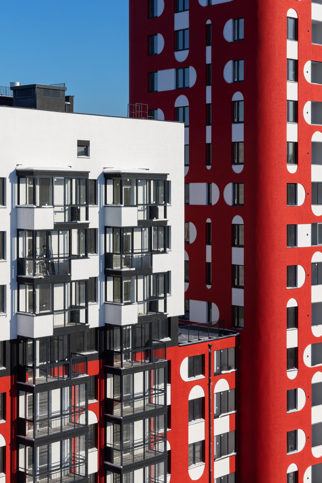 Жилой комплекс состоит из двух зданий: одно формирует уличный фронт, а другое – двор. Мы хотели подчеркнуть изгиб улицы, и на этом изгибе разместили 23-этажную башню, которая стала доминантой. Остальные секции жилого комплекса – девятиэтажные. Такое распределение высот хорошо работает на улицу – формирует доминанту при повороте, а также на дворовое пространство – создаёт уютный двор из домов средней этажности.