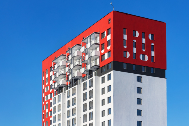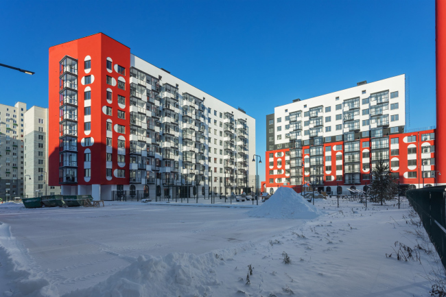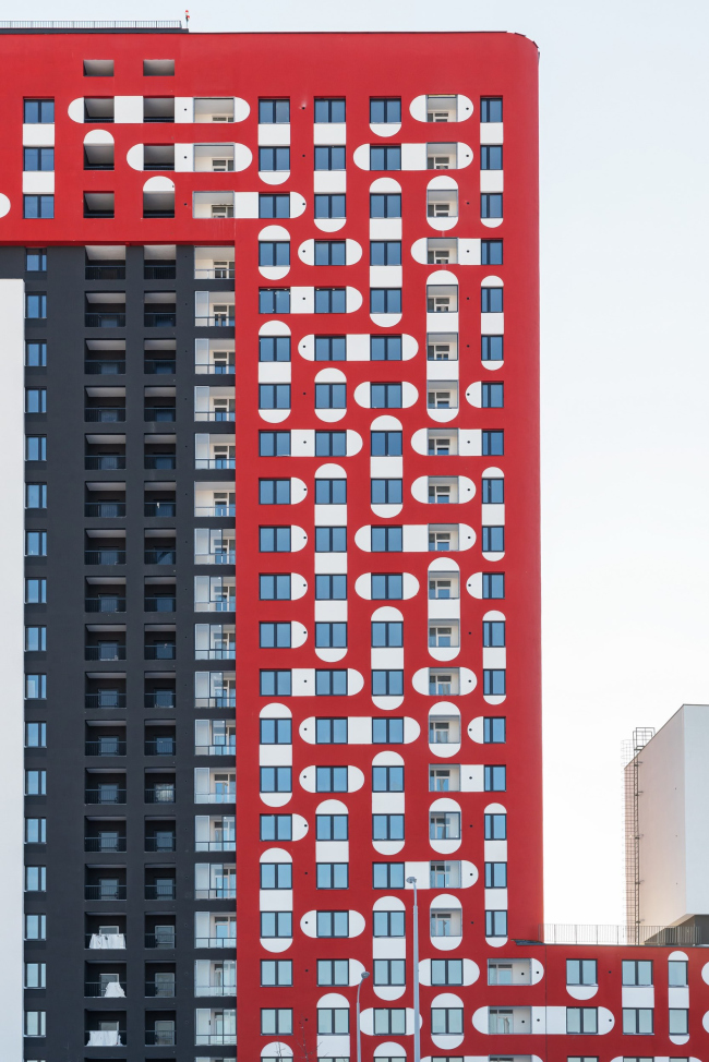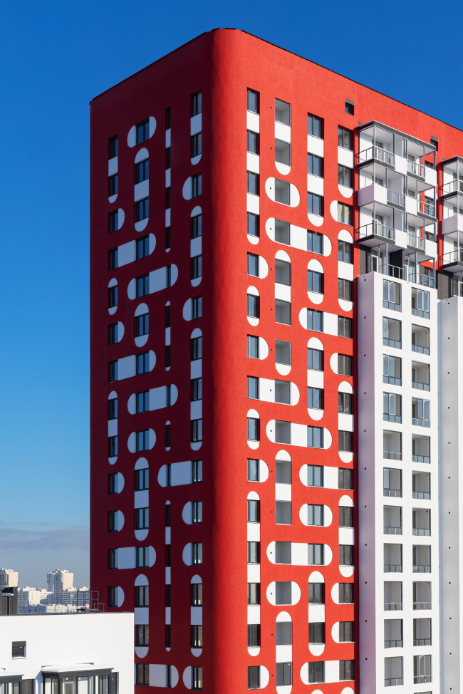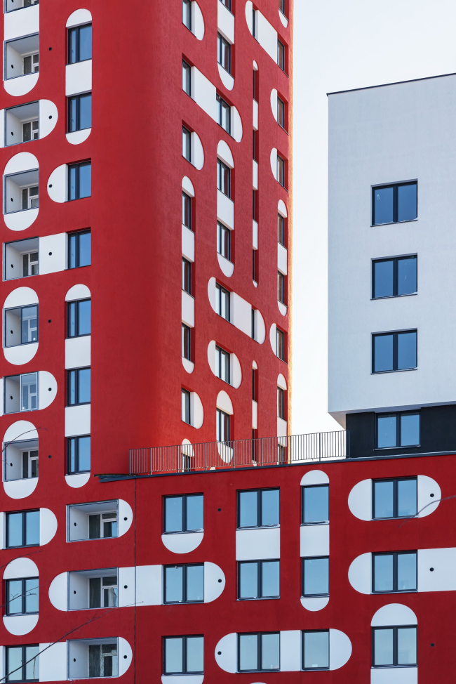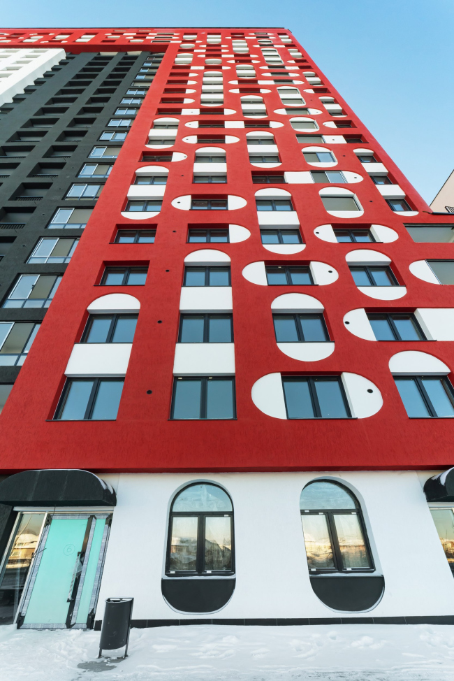 Суперграфика на фасадах жилого комплекса, построенного в Екатеринбурге по проекту бюро «План Б», вдохновлена мезенской росписью. Красный пигмент для 23-этажной башни выбрали не только как акцентный, но и устойчивый в штукатурке. Не менее яркими получились вестибюли подъездов, оформленные приемом color block.