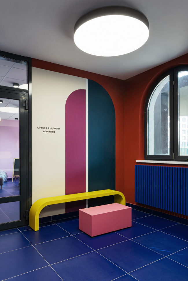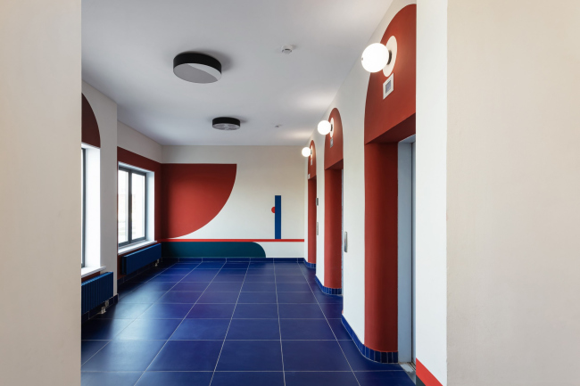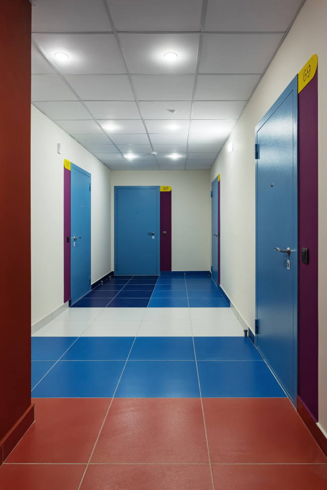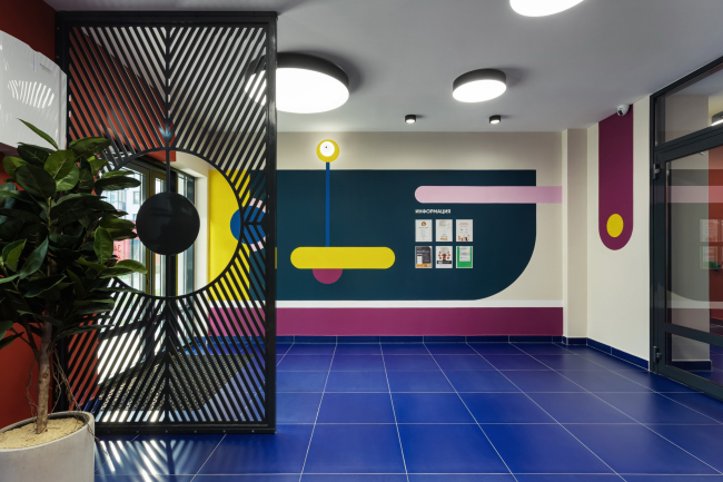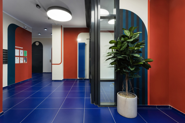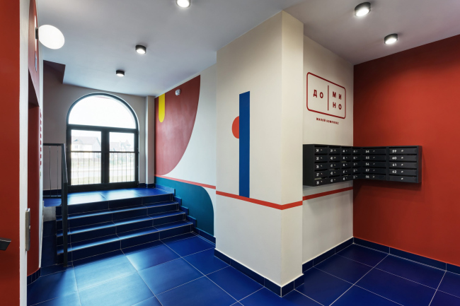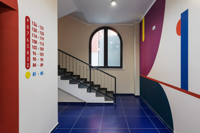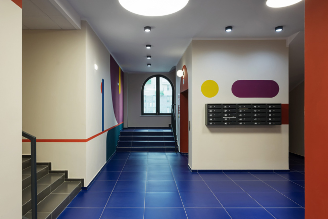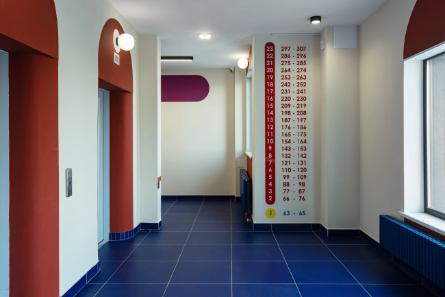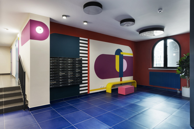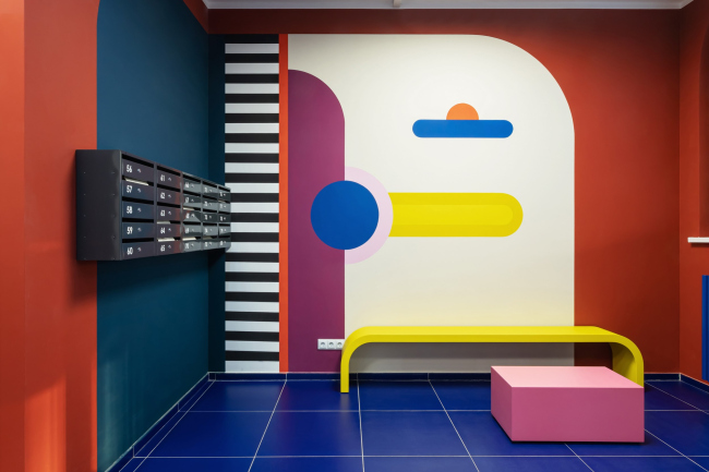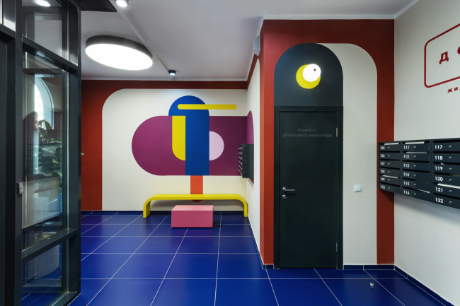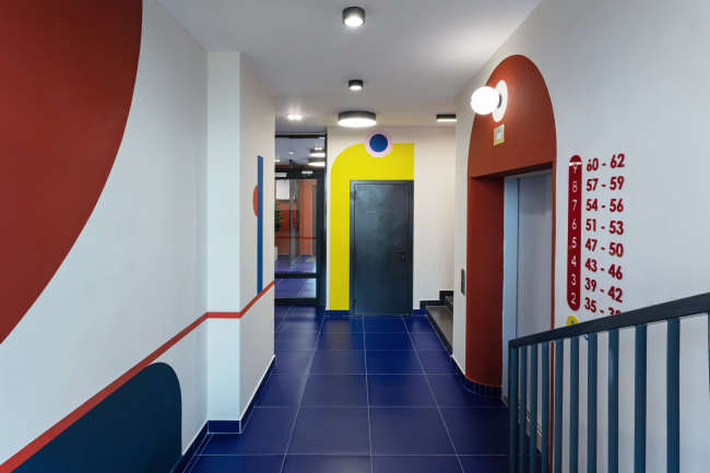 Для каждого подъезда разработан индивидуальный дизайн в стилистике Color Block. Вся мебель выполнена по индивидуальному проекту. В результате весь дом – и снаружи, и внутри – получился очень жизнерадостным. В этом проекте мы поняли, что яркие решения требуют очень-очень много времени на авторский надзор.