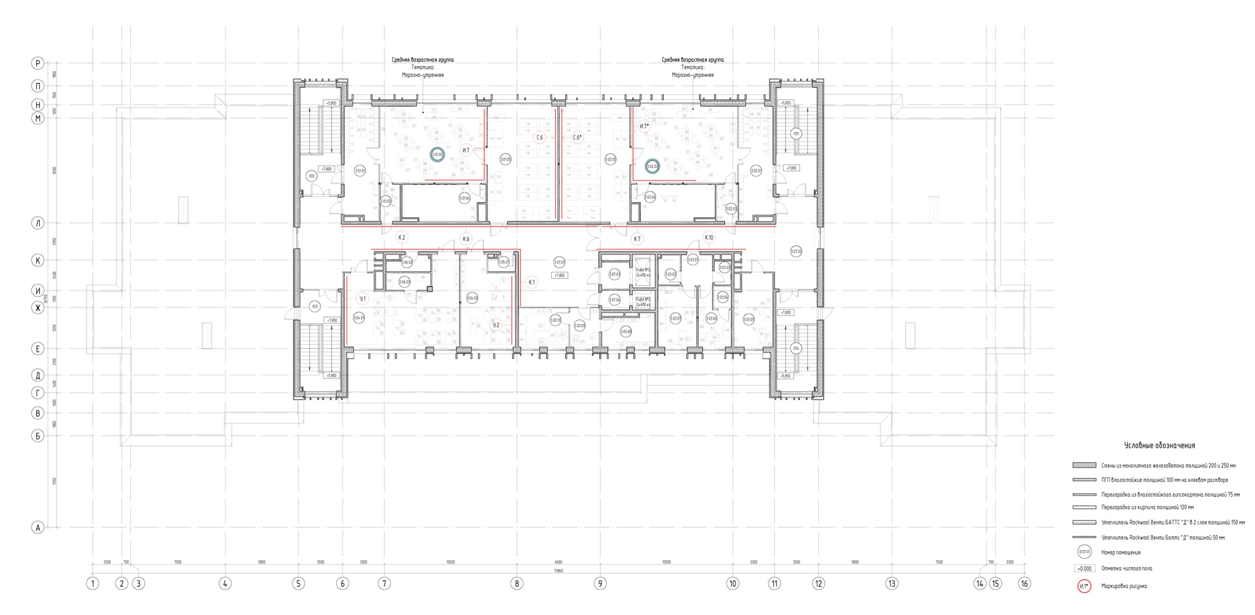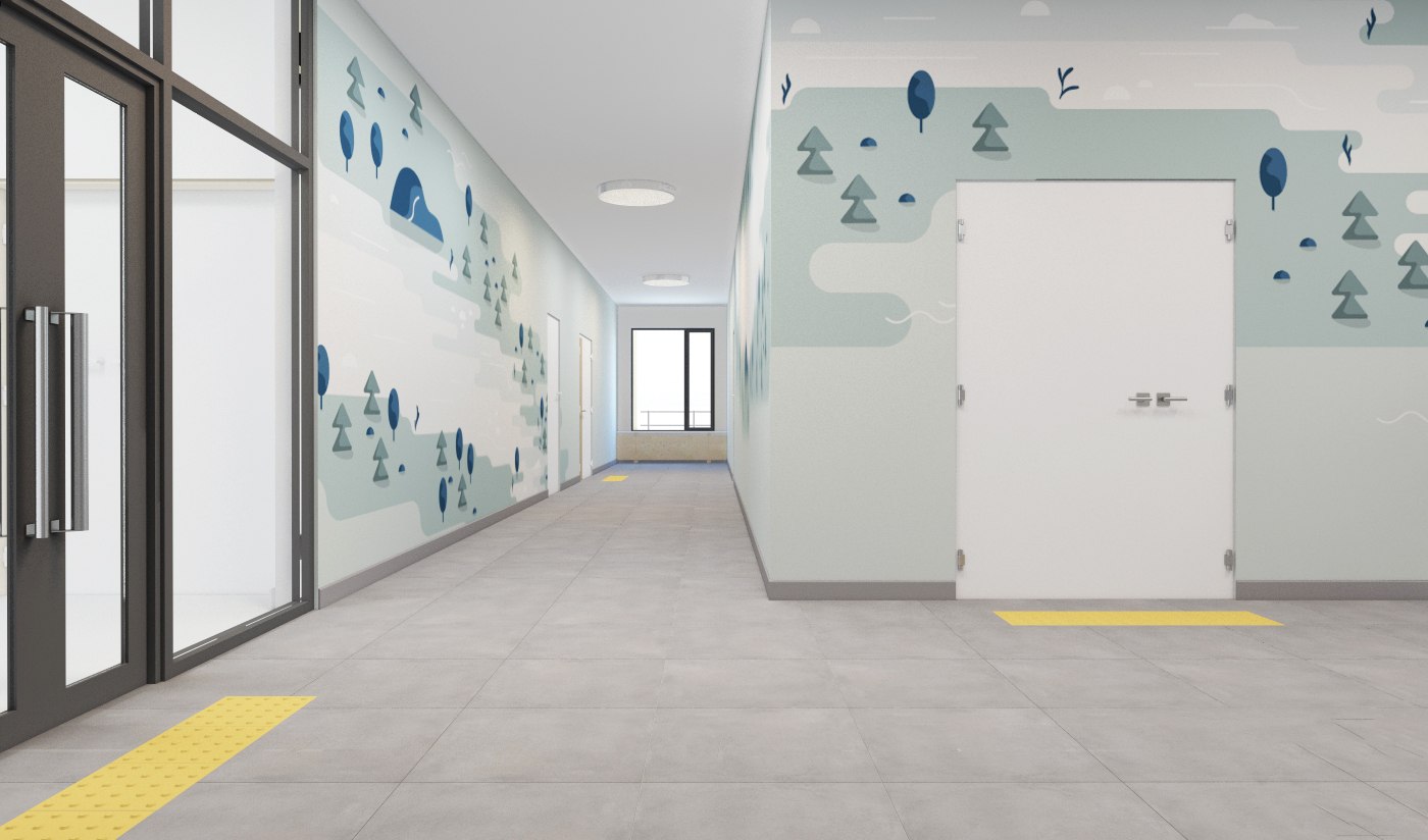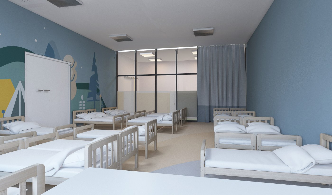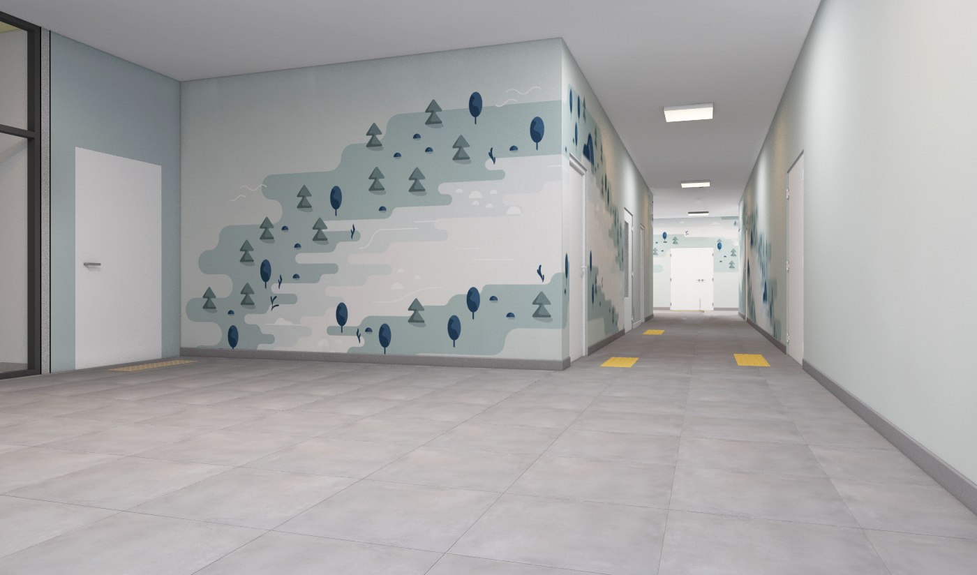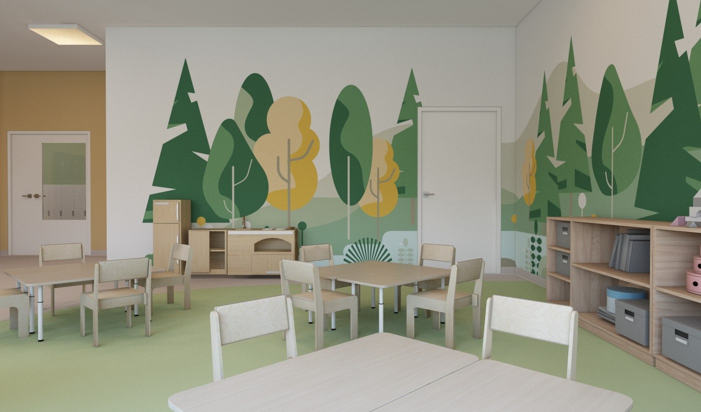 В детских групповых ячейках использованы разные подходы. Например, необычные сочетания, напоминающие Бутовский лесопарк, или загадочный лесной массив, вызывающий ассоциации с картинами сказок Ивана Билибина.