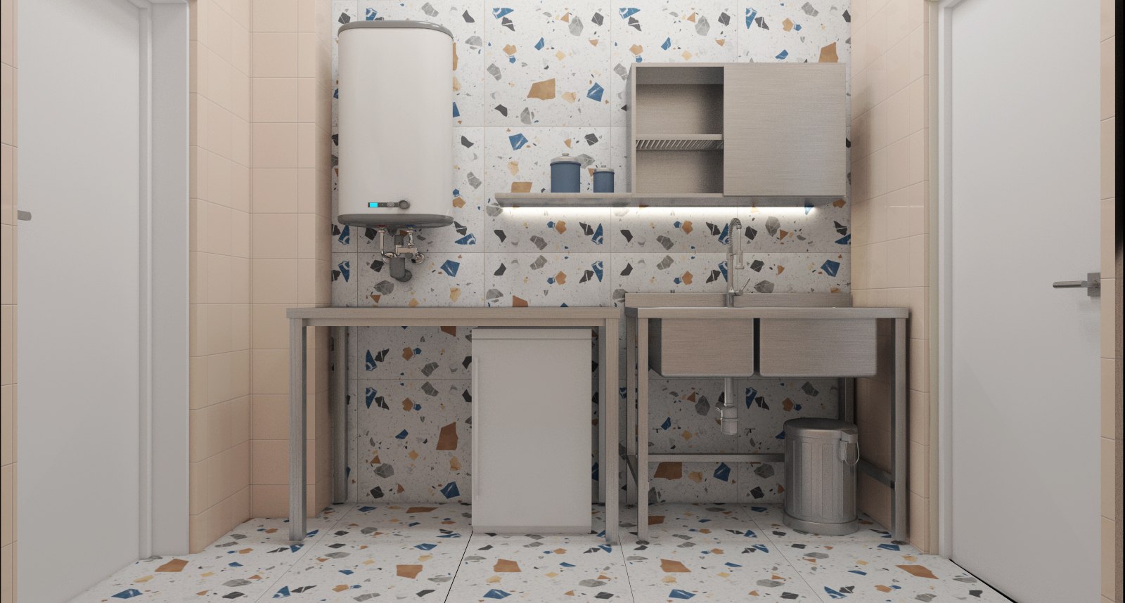 Коридор символизирует течение реки, поэтому авторы подобрали предварительное аналоговое решение для оформления холла и коридора.