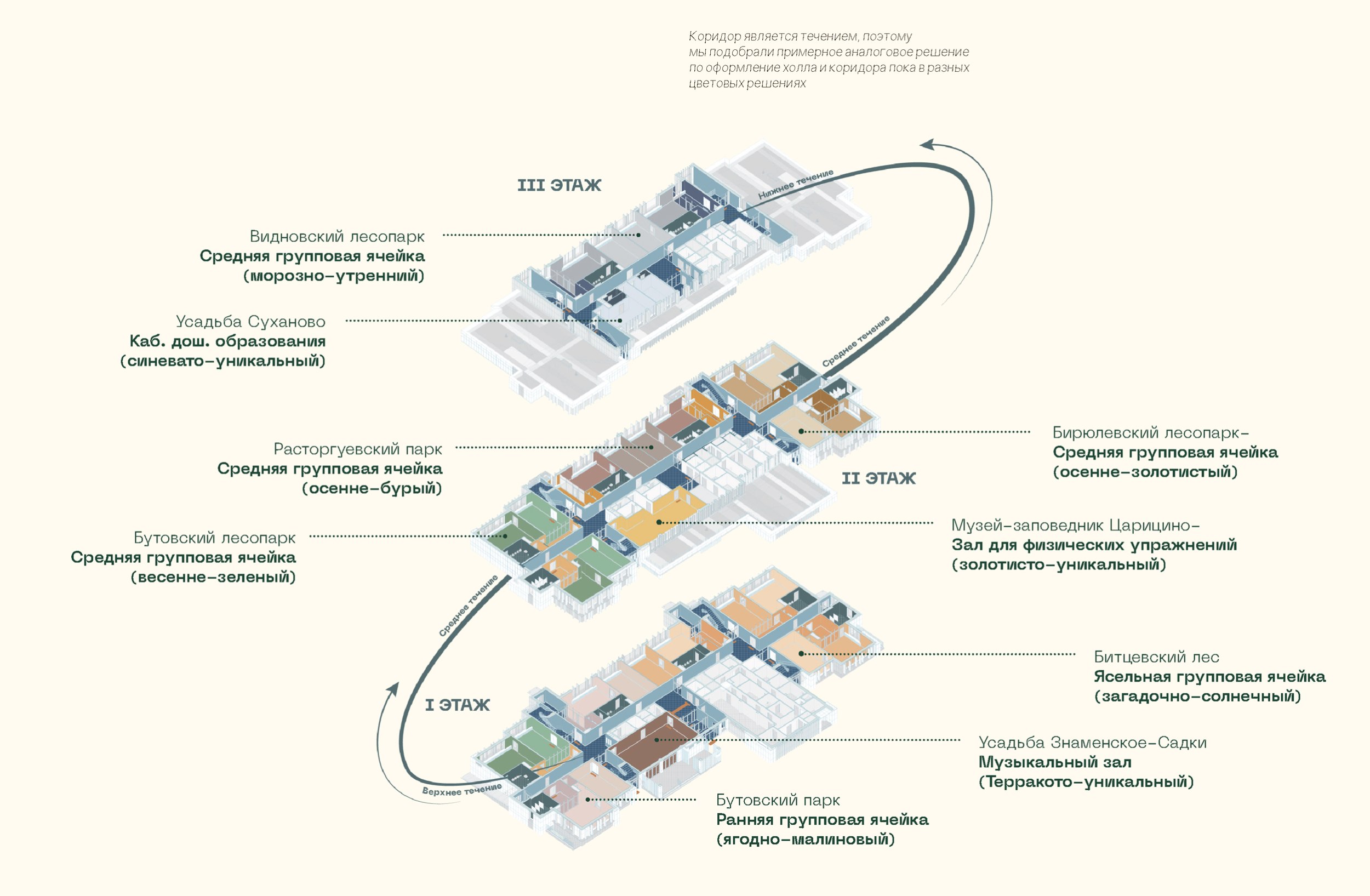 В основу концепции легла река Битца, которая является ключевым элементом сохранения и развития природной и культурной среды региона, а также человека. Мы решили сопоставить течение жизни детей в детском саду с течением реки, выделив три стадии развития: