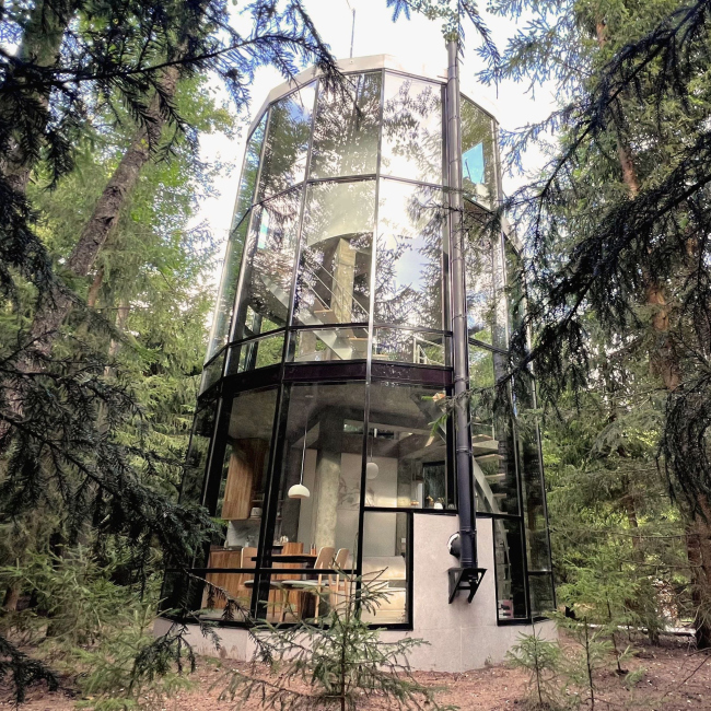 Архитектор Станислав Зыков спроектировал для небольшого лесного участка, свободного от деревьев, башню с бассейном на крыше: плавая в нем, можно рассматривать верхушки елей. Все наружные стены дома стеклянные и даже водосток находится внутри, чтобы гости могли лучше слышать шум дождя.
