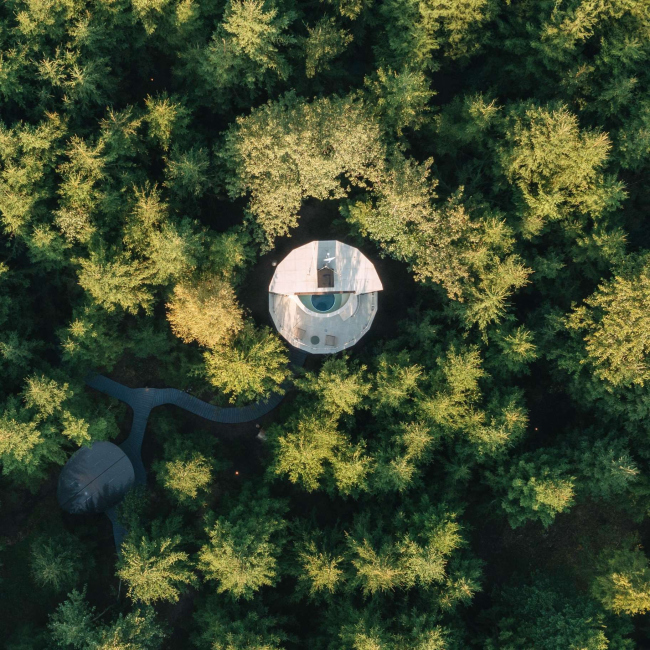 Описание предоставлено архитекторами Проект разрабатывался специально для локации: в гуще хвойного леса образовалась естественная поляна диаметром 8-9 метров, поэтому дом имеет форму цилиндра высотой 11 метров. На его крыше располагается бассейн со ... читать дальшеДом мечтателя
