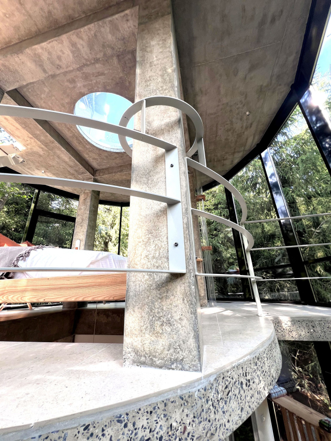 Чтобы добиться большего погружения в окружающую природу, труба дождевого водостока размещена внутри дома вдоль одной из колонн. Выполнена она из литого поликарбоната. Два 300-х сот килограммовых лестничных марша создавались на огромных вальцах, чтобы придать им изогнутую форму пружины. Их сложная конструкция и отделка позволила добиться максимальной прозрачности и невесомости.