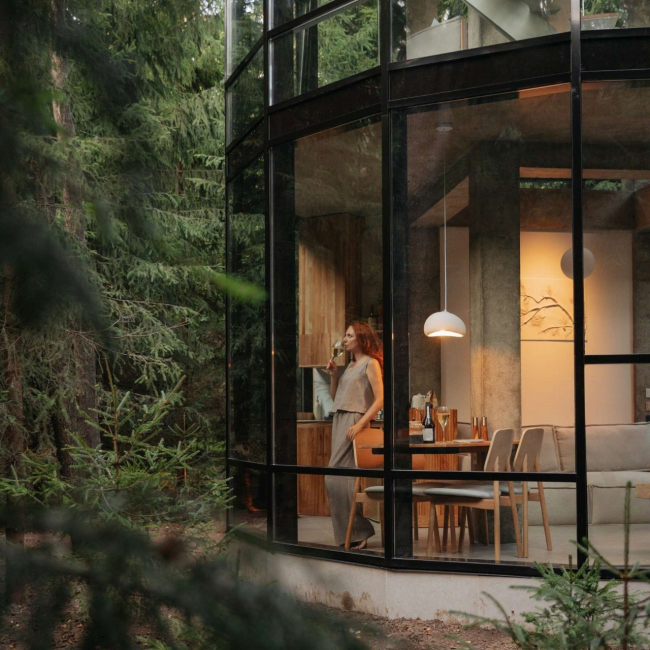 Находясь внутри дома, не ощущаются его границы и объём. Он полностью стеклянный и в нём отсутствуют шторы, поэтому, предусмотрено специальное освещение. Одно нажатие кнопки и в доме создаётся комфортный полумрак при помощи акцентного освещения. Второе нажатие и лес вокруг дома подсвечивается на глубину до 50 метров. Это создаёт чувство безопасности и комфорта даже в тёмное время суток.
