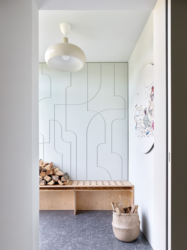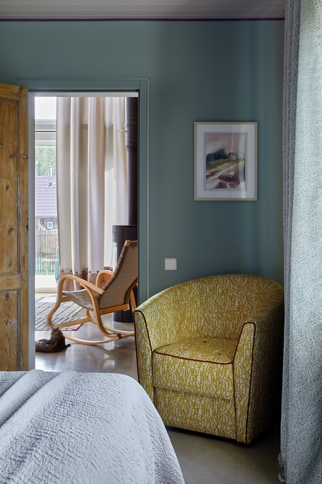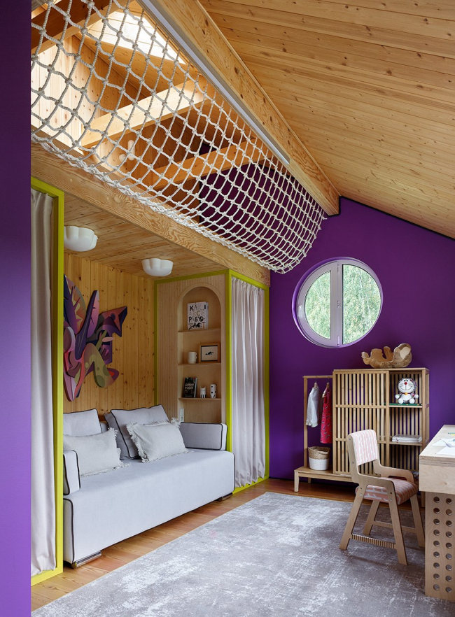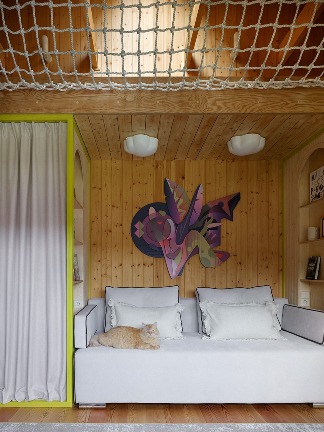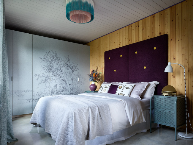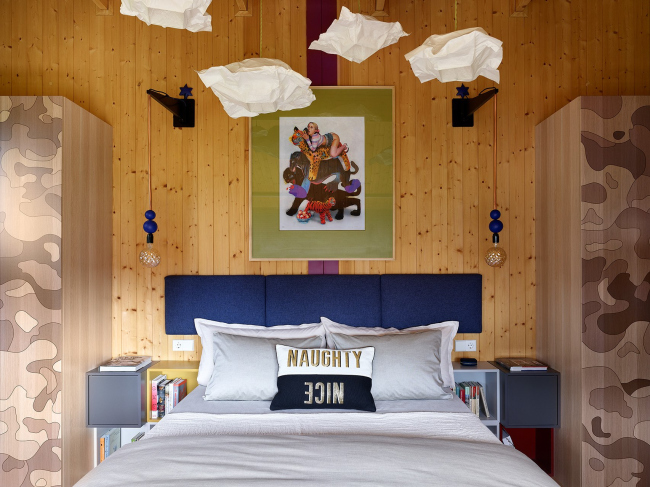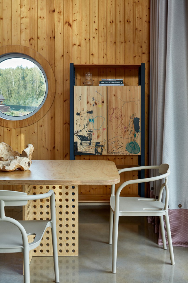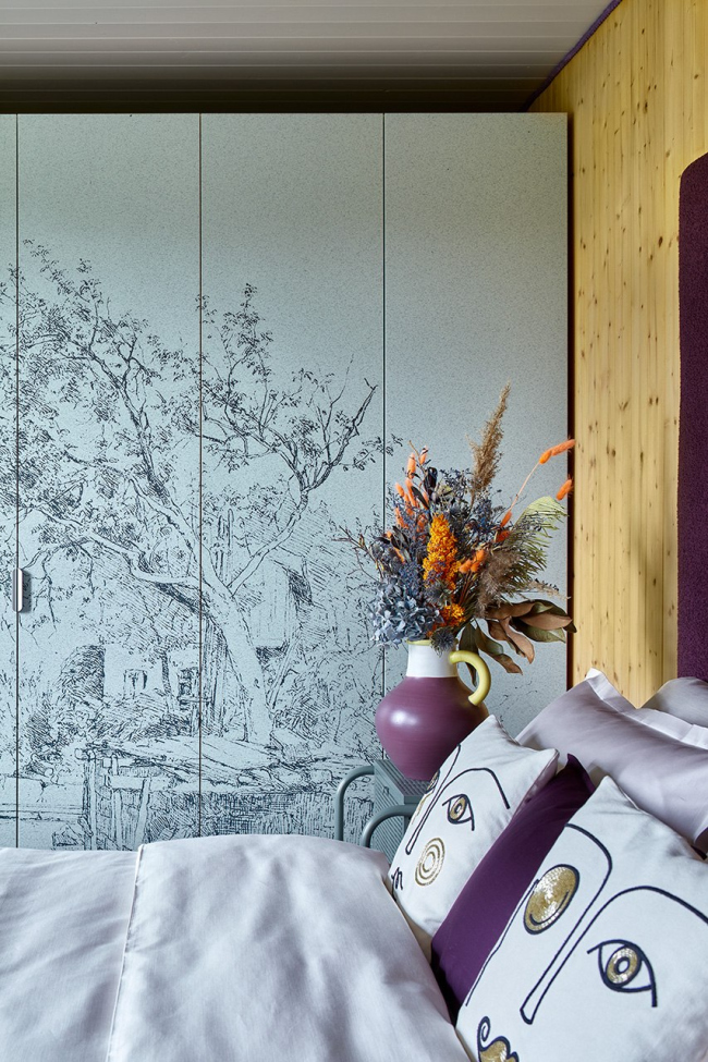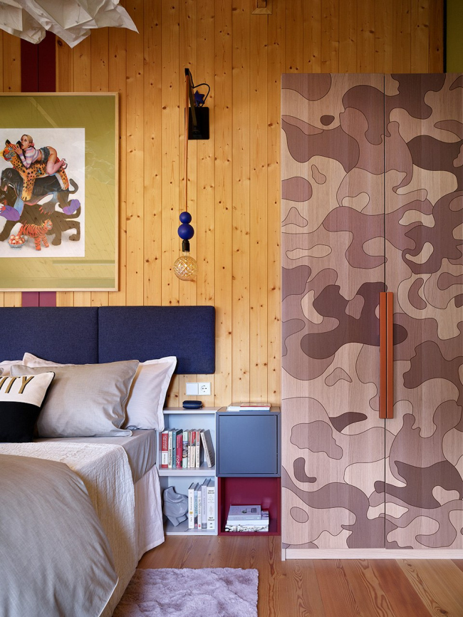 Важная тема интерьера – использование привычных дачных материалов в новом прочтении, создание современной загородной эстетики с помощью доступных средств. Простые серийные шкафы стали холстом для экспериментов с УФ-печатью: в мастер-спальне на фасадах появился камуфляжный паттерн, разработанный для одного из проектов Хомяковых, но не нашедший воплощения, а в спальне родителей – увеличенная графика из коллекции музея Метрополитен. В гостиной стены украшают детские рисунки дочки архитекторов, перенесенные на фасады мебели.