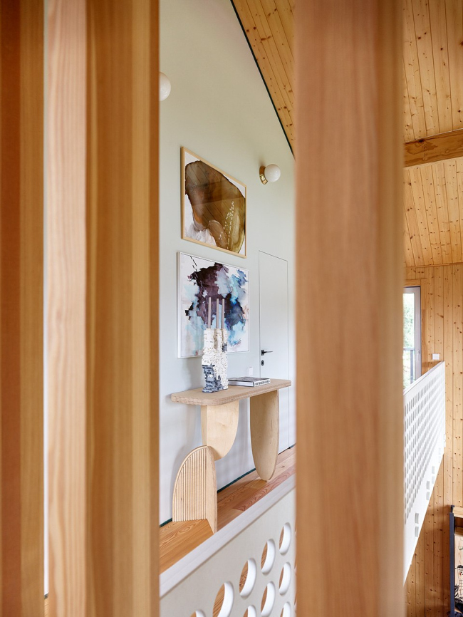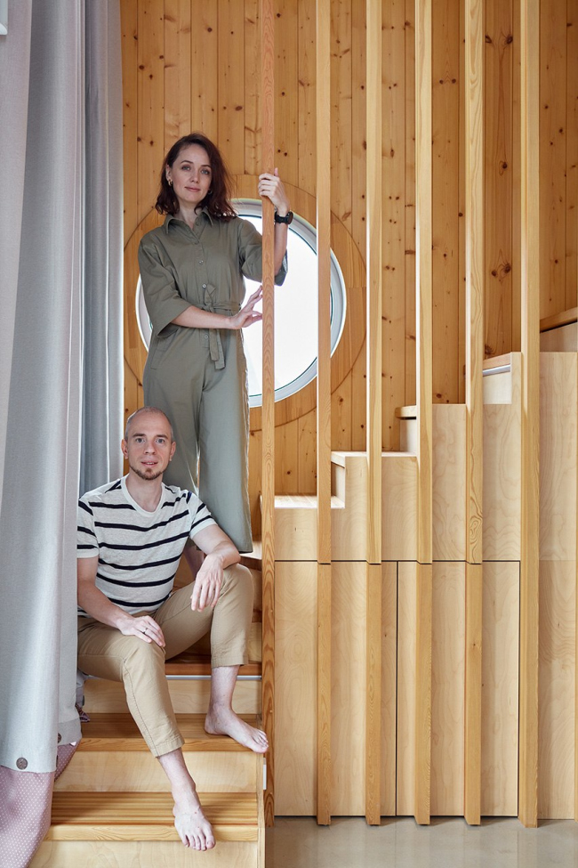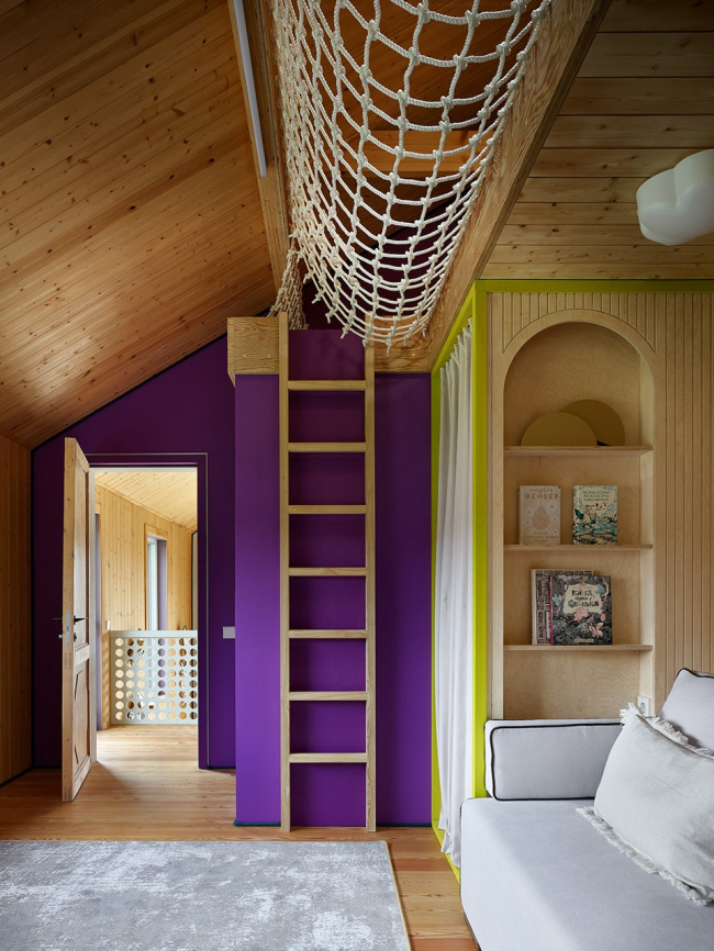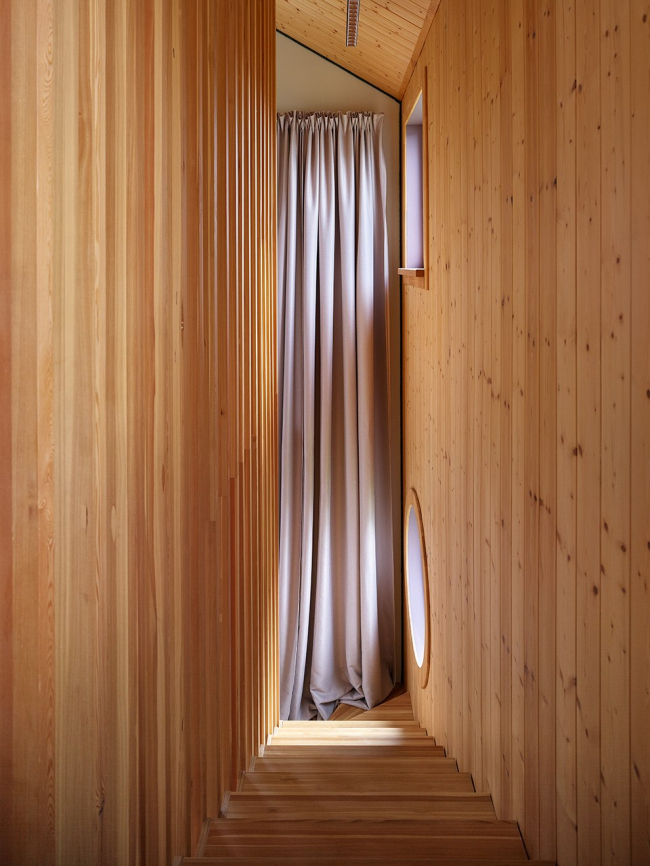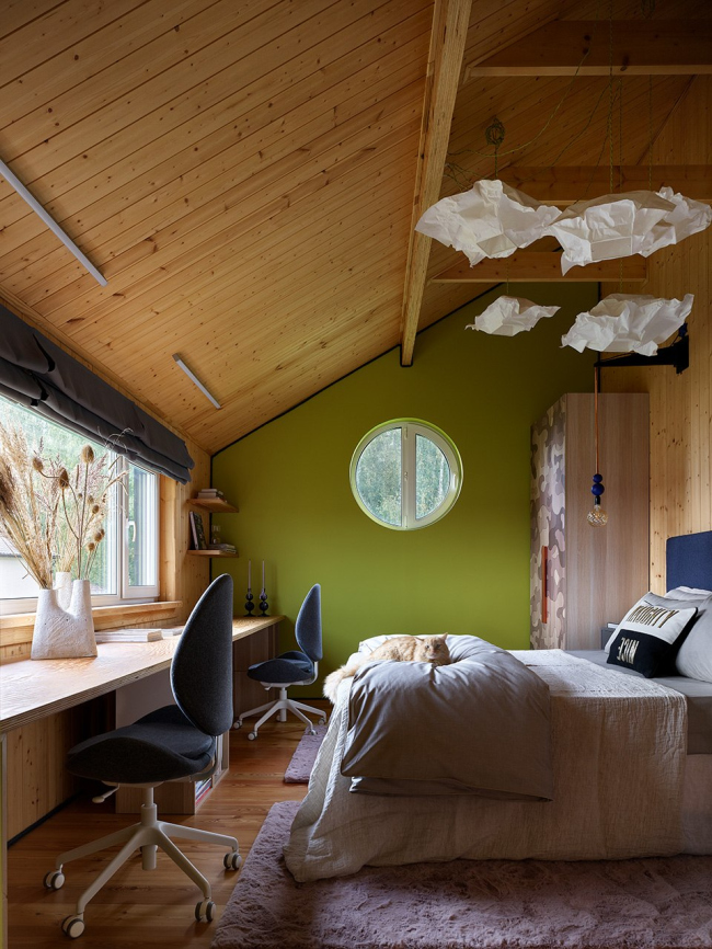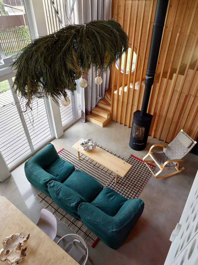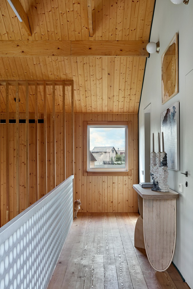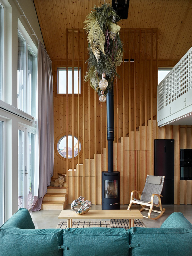 Первоначально дом задумывался как загородный вариант для выходных, однако в процессе строительства планы изменились – теперь здесь живет вся семья архитекторов, включая двух котов, для которых предусмотрена автоматическая дверка в прихожей. Уютный чердак с мансардным окном стал любимым местом для детей, а лестница с подсветкой – настоящим хитом среди гостей.