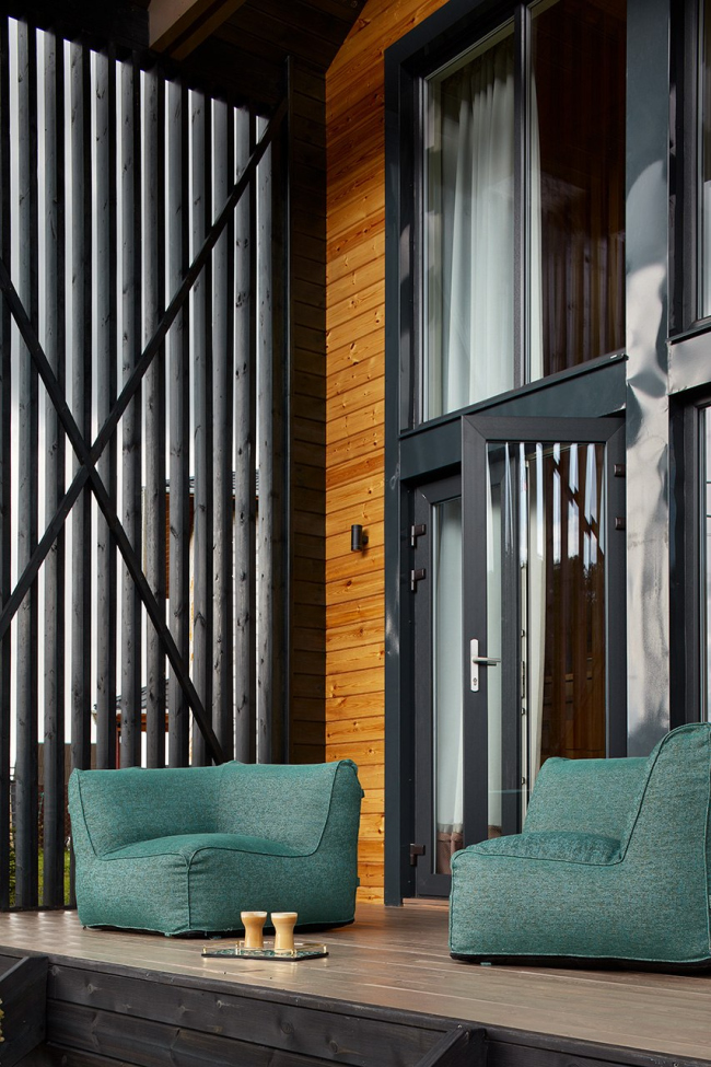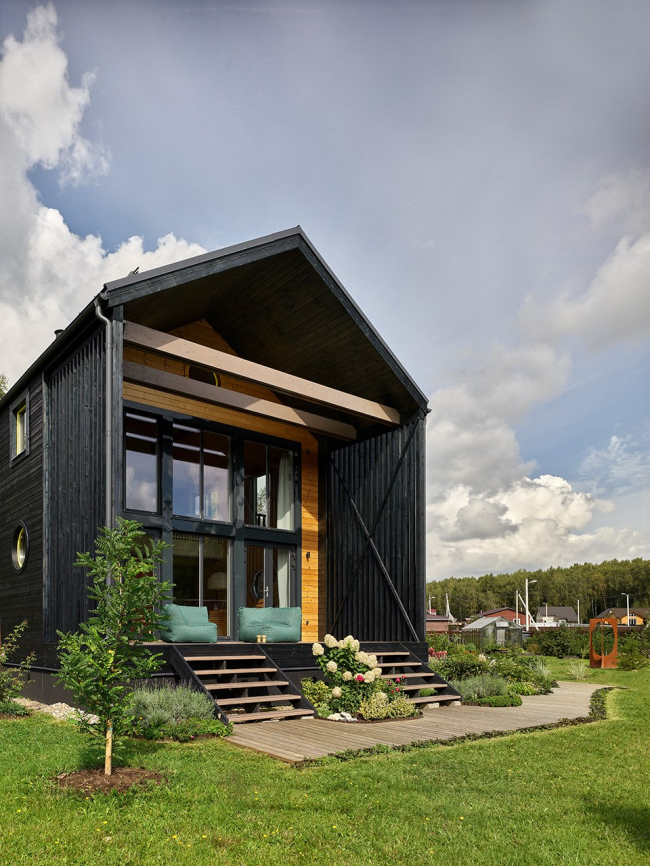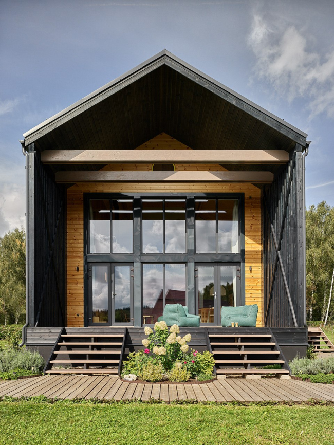 Собственный дом архитекторов студии Quatrobase в Московской области изобретателен и включает множество нестандартных решений: двусветную гостиную при каркасной технологии строительства, темный фасад и контрастные окна, а также целый ряд интерьерных и технических находок.