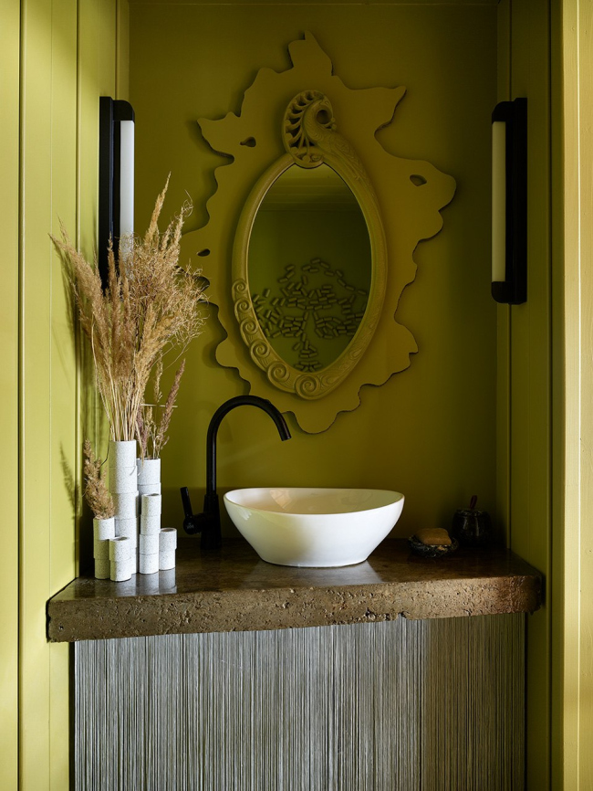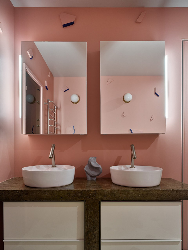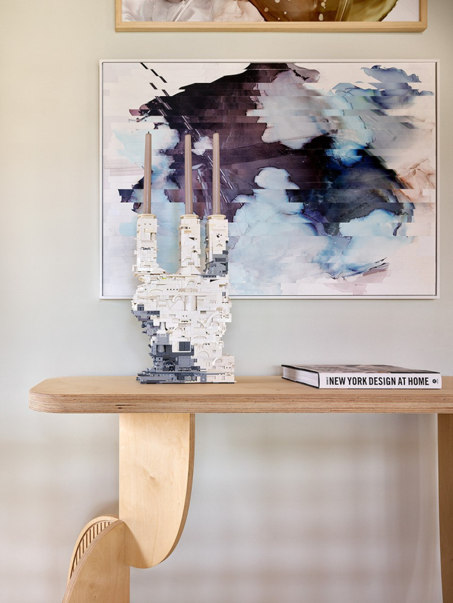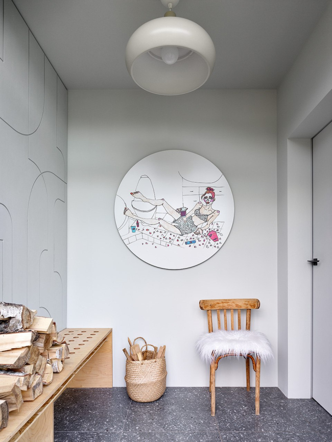 Неотъемлемой частью проекта стало искусство: садовые скульптуры из ржавого железа, объемное панно в детской, «надутые» капли из стали в гостиной, портрет Давида из винных пробок в санузле. В интерьере также представлена живопись из личной коллекции и авторские работы, некоторые из которых ожидали своего часа несколько лет.