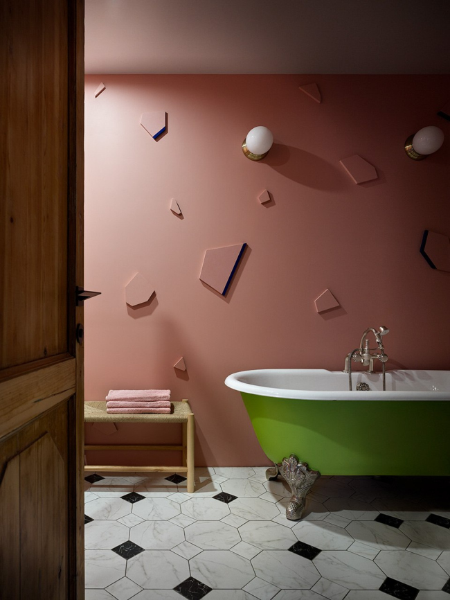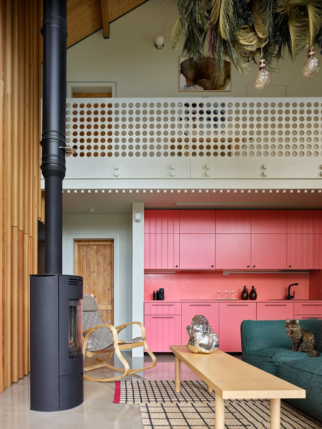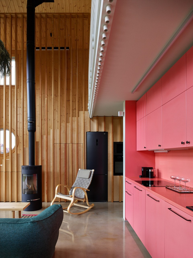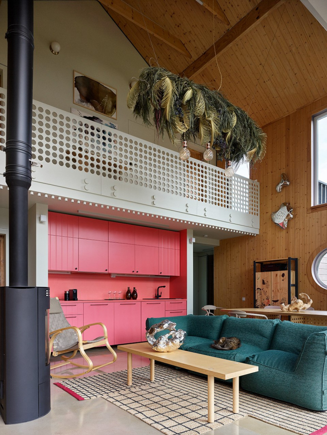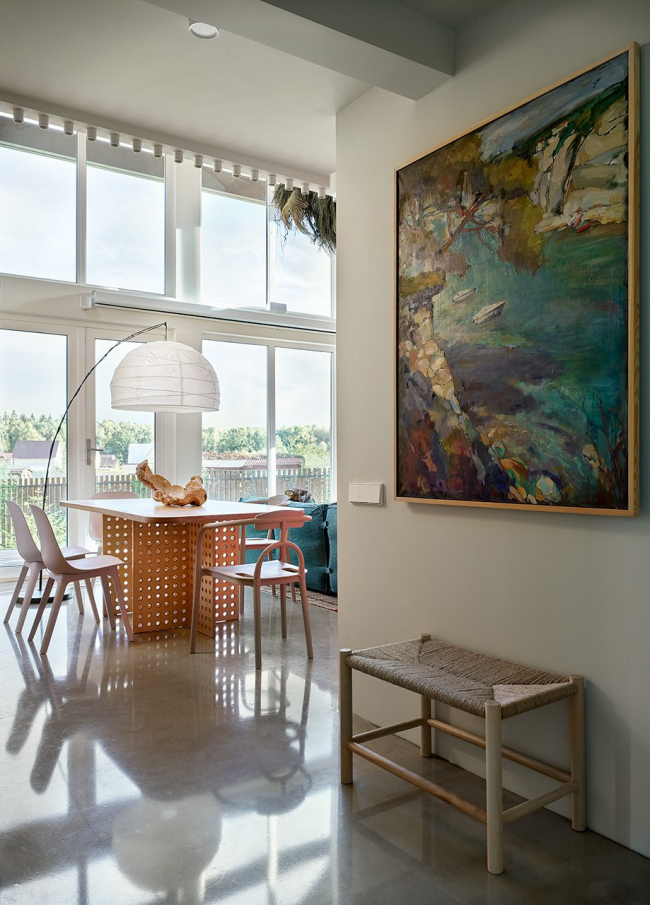 Интерьер сочетает функциональность и креативность: раздвижные двери позволяют легко перемещать обеденный стол на террасу, люстра в гостиной декорирована стабилизированными растениями, а серийные кухонные фасады перекрашены в лососевый оттенок в столярной мастерской.