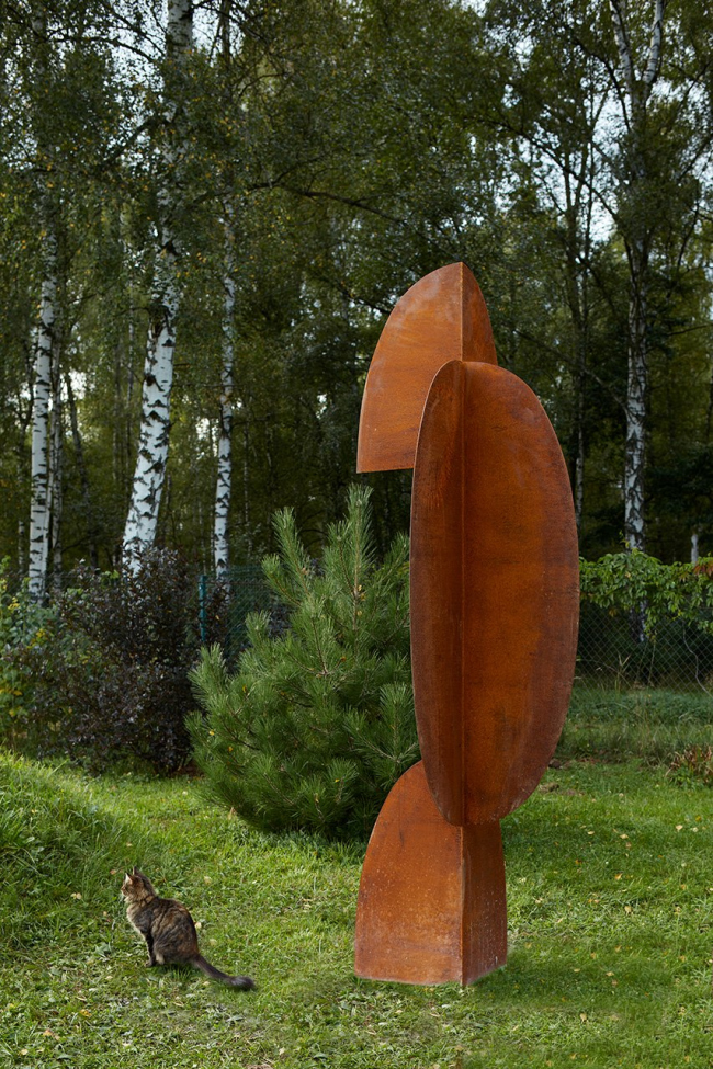 Ландшафт задумывался как естественный: разнотравные лужайки, клумбы с белыми, фиолетовыми и желтыми акцентами многолетних цветов, «дикие» деревья и кустарники. Огород с дизайнерской теплицей расположен в дальнем углу участка, а две крупные стальные скульптуры создают диалог форм, встречая гостей у въезда и завершая композицию на северной стороне.