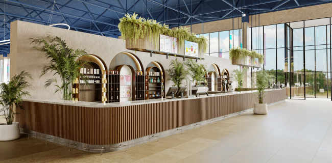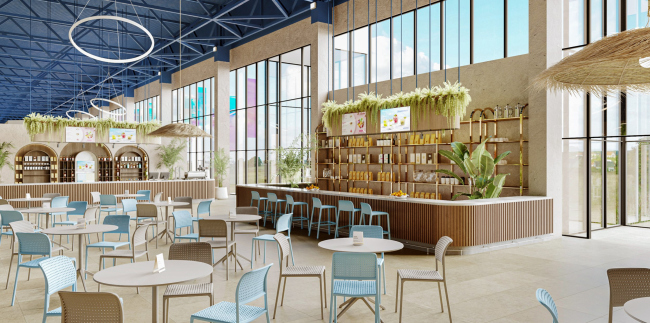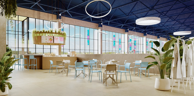На территории также – 4 кафе и фитобара с разнообразным меню и напитками.