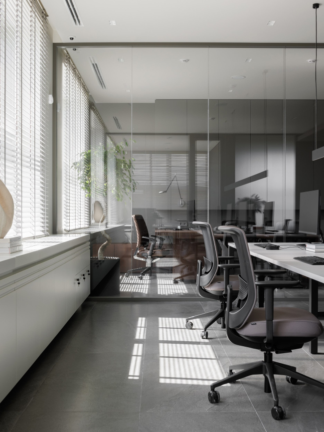 Необходимо было создать современное, максимально свободное пространство для комфортной работы разных по направлению деятельности отделов. Поэтому нужны были как изолированные кабинеты, так и частично или полностью открытые. Мы использовали стеклянные перегородки в сочетании с глухими стенами: где-то стекло в перегородках матовое, а где-то прозрачное. Так мы закрыли вопрос звукоизоляции и видимости, оставляя помещения максимально цельными визуально. На руку сыграло и большое количество окон, что позволило сделать все кабинеты хорошо освещенными, а возле входа организовать многофункциональное пространство, выполняющее роль лобби и рабочей зоны одновременно.