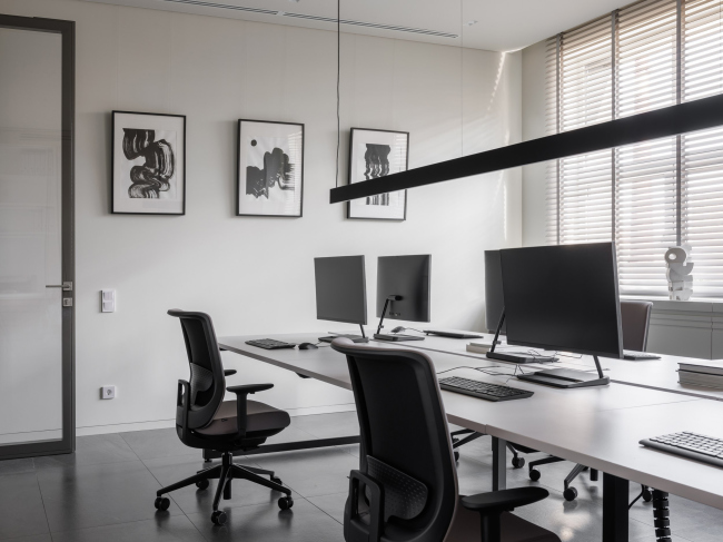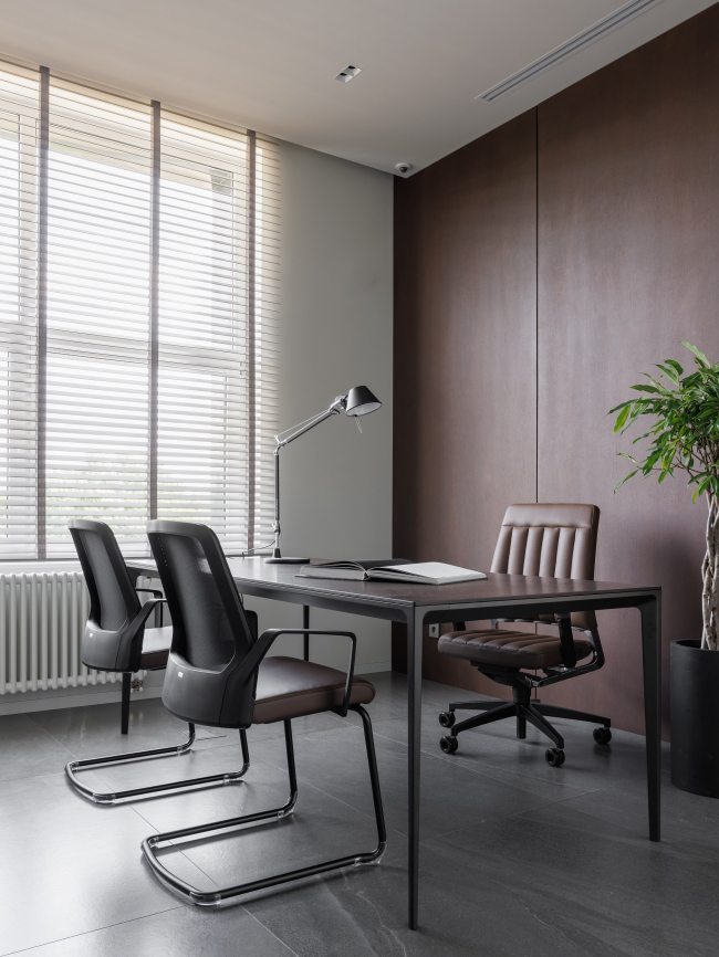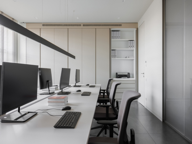 Мебель, в первую очередь столы и кресла, приобрели у зарубежных брендов. Кресла для посетителей и журнальный столик выбрали у Cassina. Стол в кабинете учредителя от Rimadesio. Для сотрудников подобрали кресла Interstuhl и Actiu, а также столы Actiu. Внимание уделили и освещению – бра в кабинете генерального директора от Artemide, люстра на кухне от Flos.