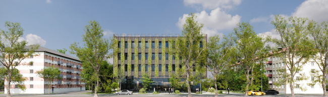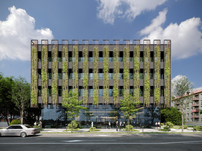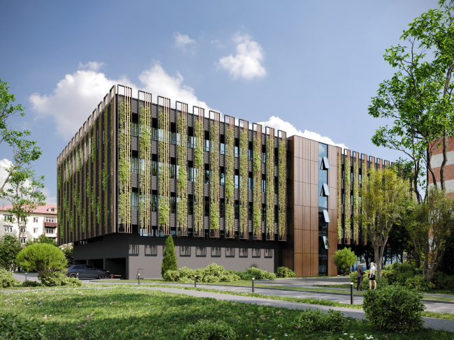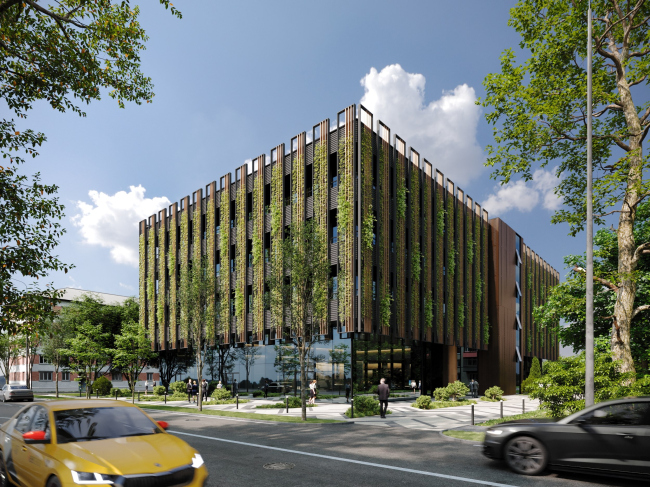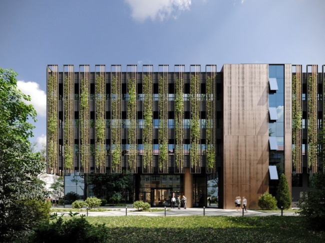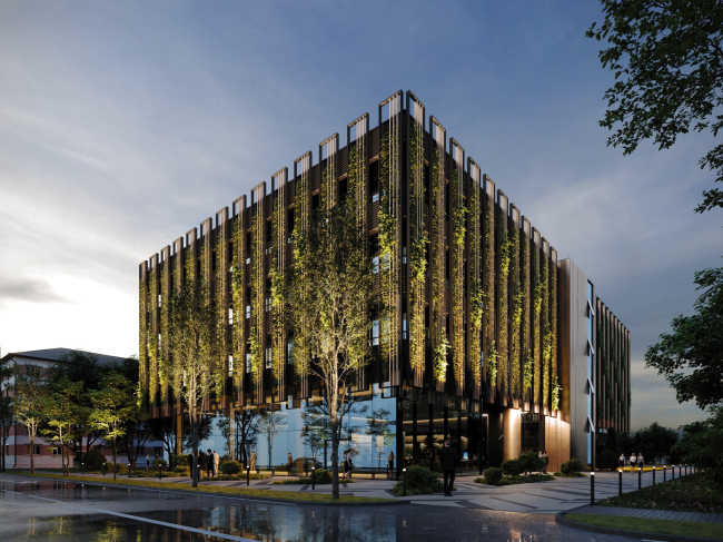 Архитектурная форма здания решена как композиция двух пересекающихся объемов, контрастных по структуре и материалам. Фасады организованы ритмично и логично подчинены архитектурному рисунку. Внутренняя часть представляет собой плоский остеклённый объём, в то время как наружный – пространственный контур из ламелей и вертикального озеленения, которое гармонично интегрировано в фасадную структуру. Этот элемент решает сразу несколько задач: акцентирует объём, оживляет плоскости фасада, снижает визуальную плотность и адаптирует здание к характеру окружающей среды. В вечернее время фасад дополнительно раскрывается за счет архитектурной подсветки с использованием схемы «светового фасада». Световой сценарий поддерживает архитектурную структуру, не перегружая её декоративными эффектами.