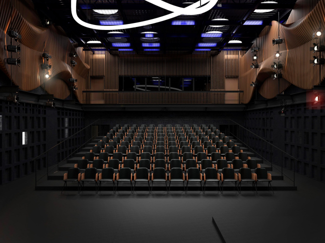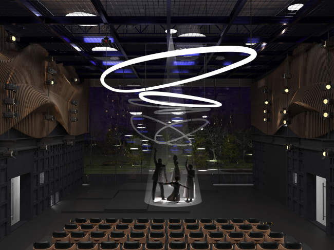 Малый многофункциональный зал представляет собой зал-трансформер, одним из элементов трансформации которого стала стена зрительного зала, раскрывающая перед зрителями вид на парковую зону. Этот эффект можно использовать при театральных постановках. Такое решение позволит вовлечь присутствующих в зале в особую атмосферу, создавая дополнительный интересный фон и усилив эмоциональный эффект от постановок.
