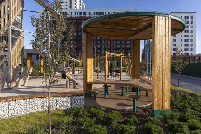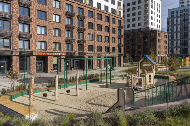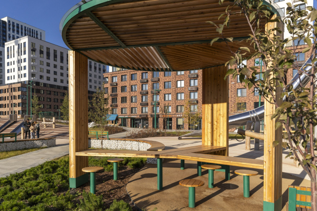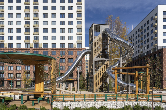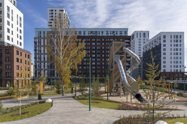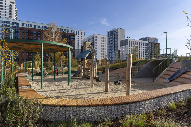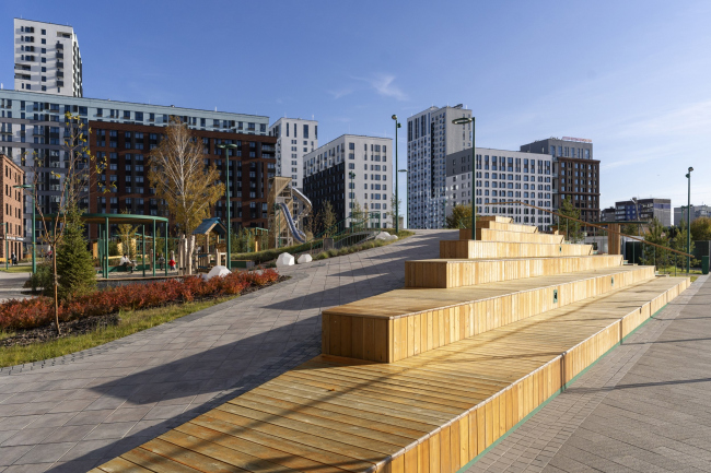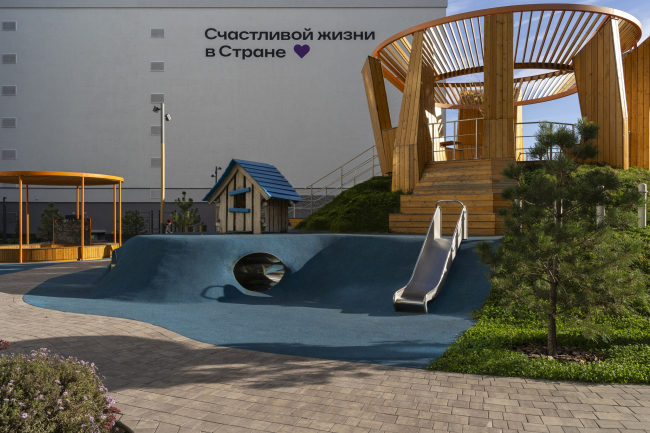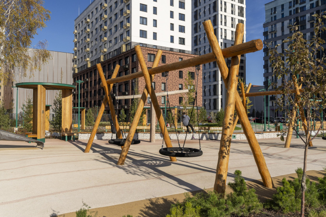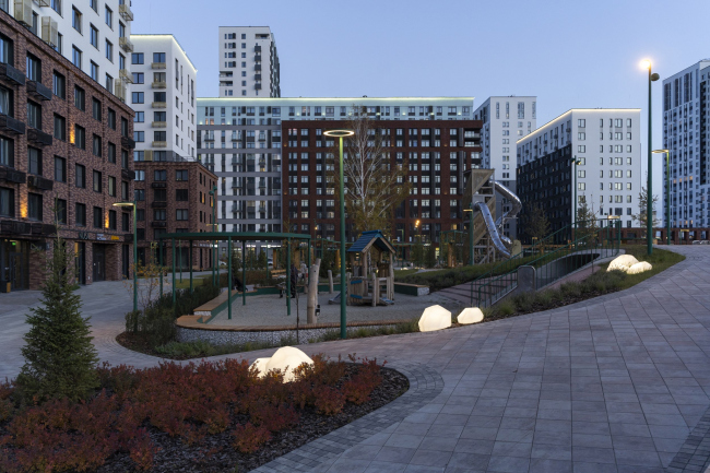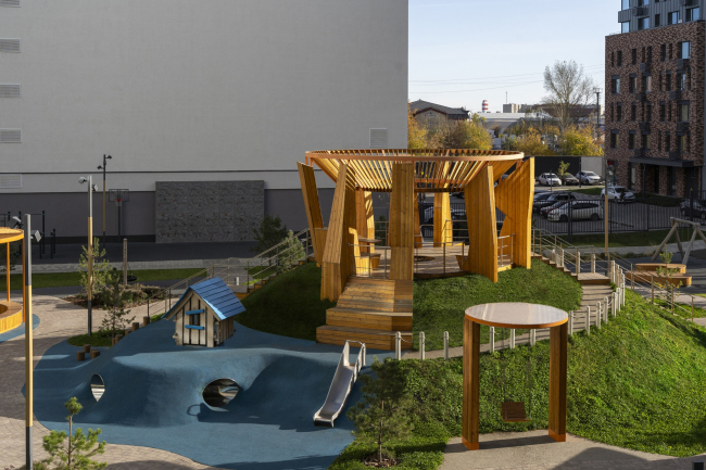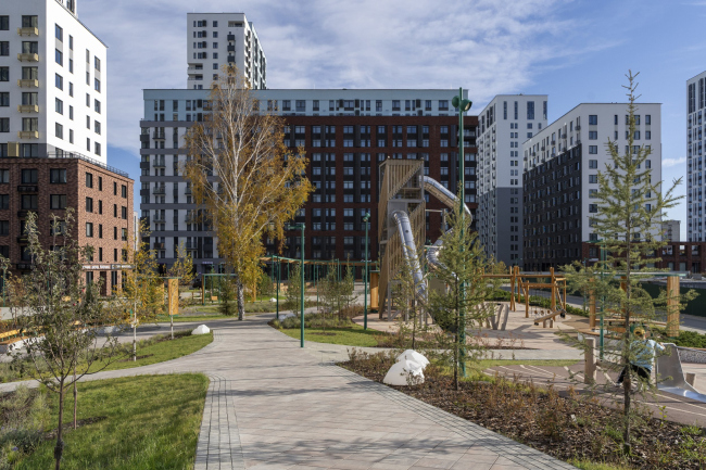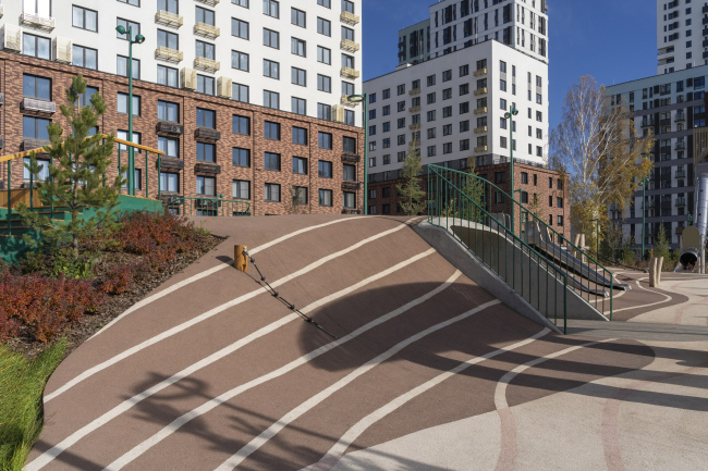 Здесь мы поработали с рельефом. Бульвар местами раздваивается: то вздымается в горку, то становится плоским, то ведет в тоннель на детской площадке.