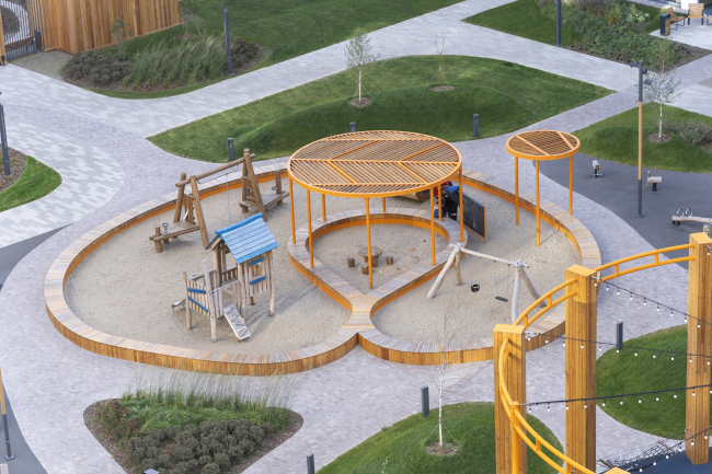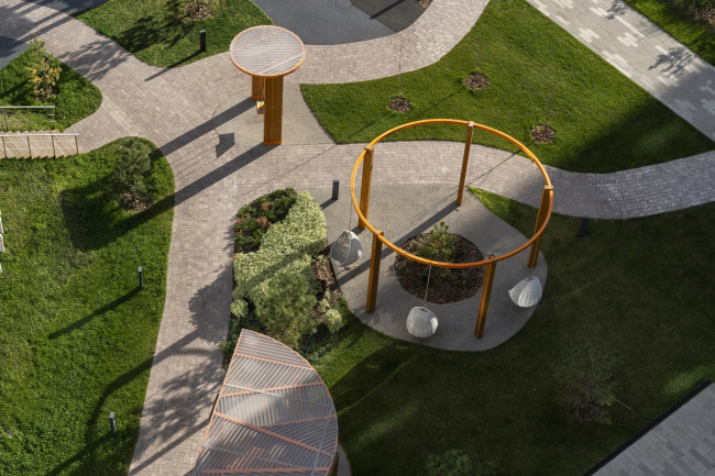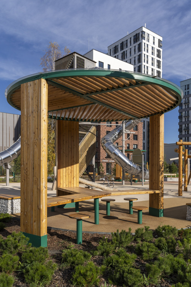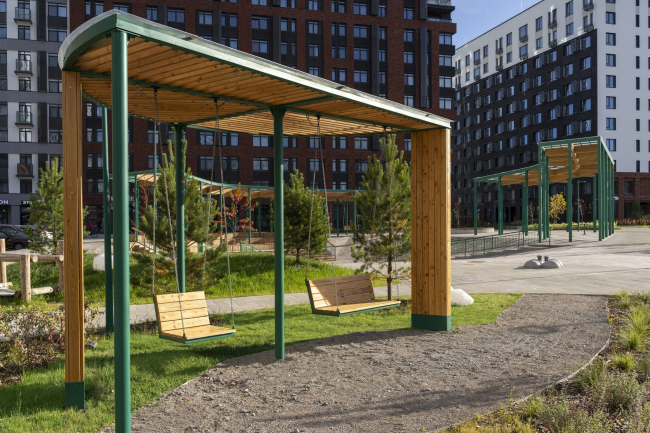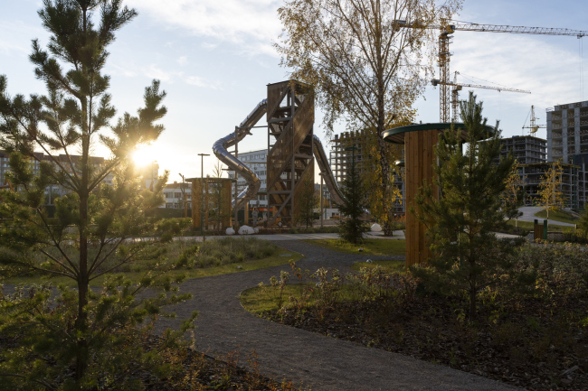 В «лесу» висят гамаки, на «озере» плавают утки, на памп-треке едут самокатчики, на «горе» висит качель.