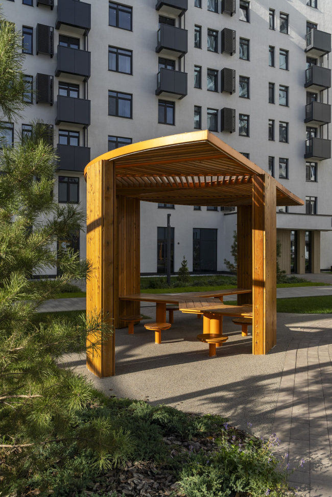 Главная идея двора «Северная тайга» – медвежья ротонда, она же верховая берлога хозяина тайги. В перголах и беседках использован контраст легких и массивных конструкций: толстые колонны и легкий верх и наоборот – тонкие колонны и массивные конструкции навеса.
