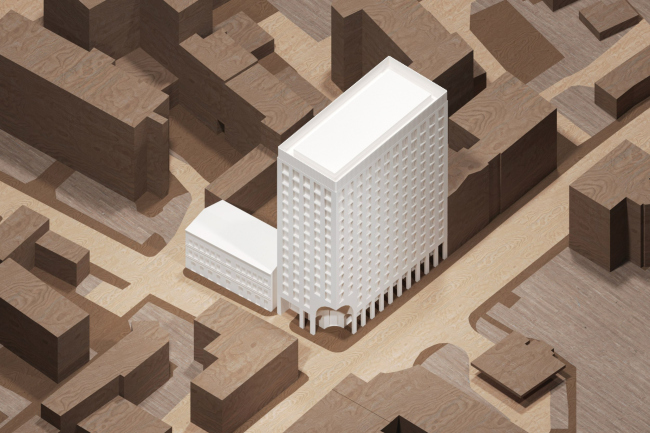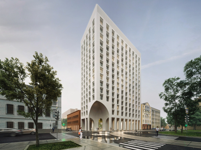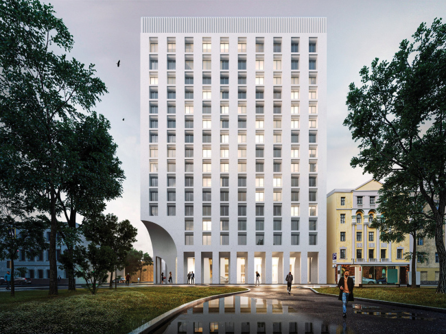 Величественная, но при этом аскетичная архитектура нашего объекта передаёт глубокое уважение и внимание к горожанам и ценителям уникальной современной архитектуры. Как бы естественным образом возникший портал на углу здания как бы приглашает зрителя в «театр» нашего объекта.