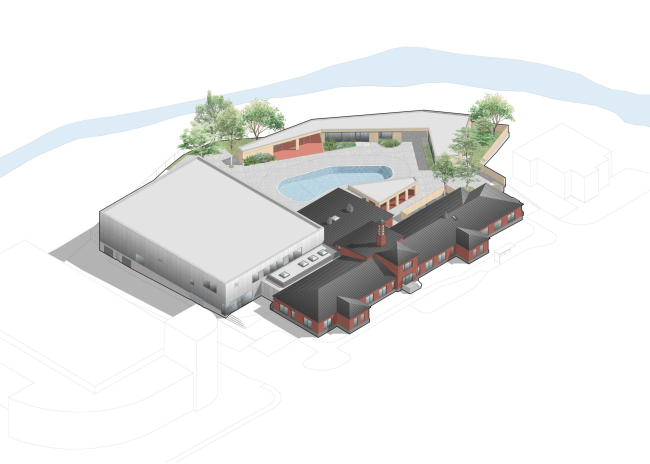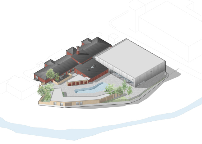 Здание бани реконструируется, к нему пристраивается новый современный объем терм, вмещающий необходимые по заданию функции. Пространство участка благоустраивается вокруг открытого всесезонного бассейна.