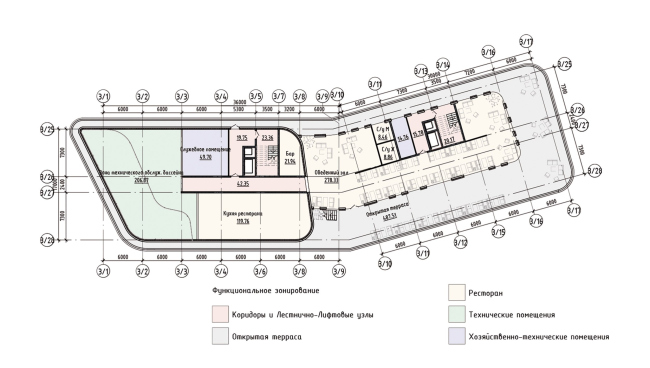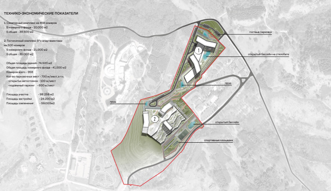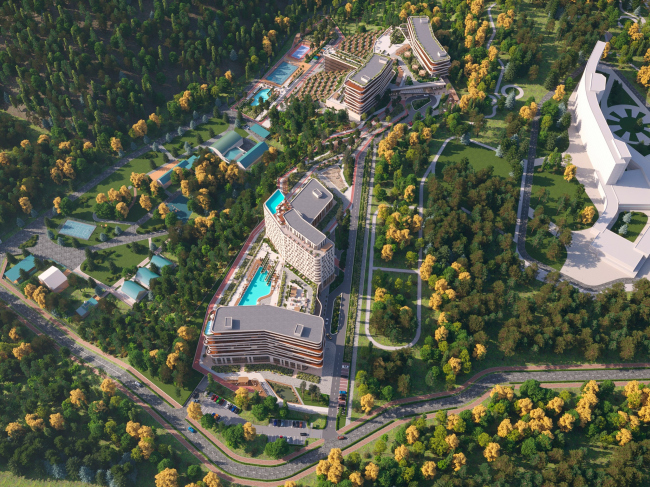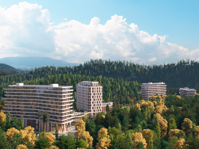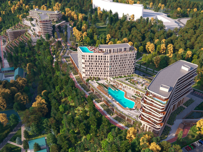 Гостиничный и санаторный корпуса объединены стилобатом с общественными функциями – рестораном, SPA, лаунж-зонами. Большие витражи, открытые пространства и продуманная навигация создают ощущение лёгкости и природной открытости.