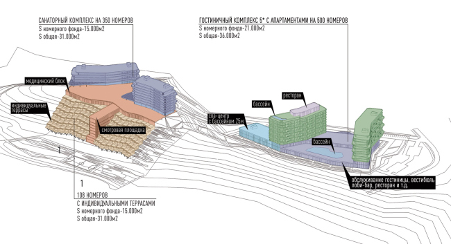 Описание предоставлено архитекторами Сейчас участок занимает здание санатория Каскад : оно простояло недостроенным много лет и находится в аварийном состоянии, поэтому было принято решение о его демонтаже. Архитекторы постарались сохранить и переос... читать дальшеРеконструкция санатория «Каскад» в Кисловодске