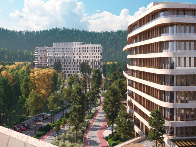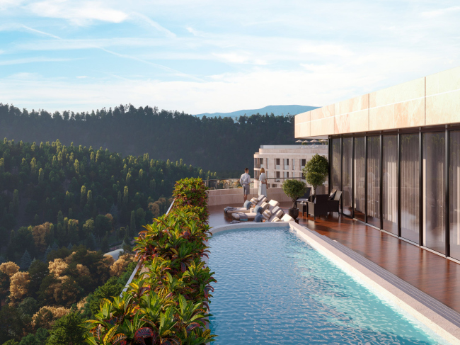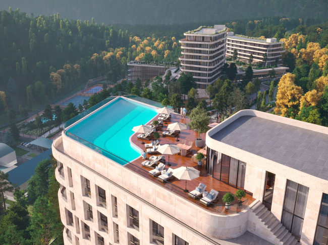 Сейчас на этом месте – недостроенное здание старого санатория «Каскад». Оно простояло много лет и находится в аварийном состоянии, поэтому было принято решение о его демонтаже. Мы постарались сохранить и переосмыслить главную идею – каскадность, которая когда-то и дала название этому месту.