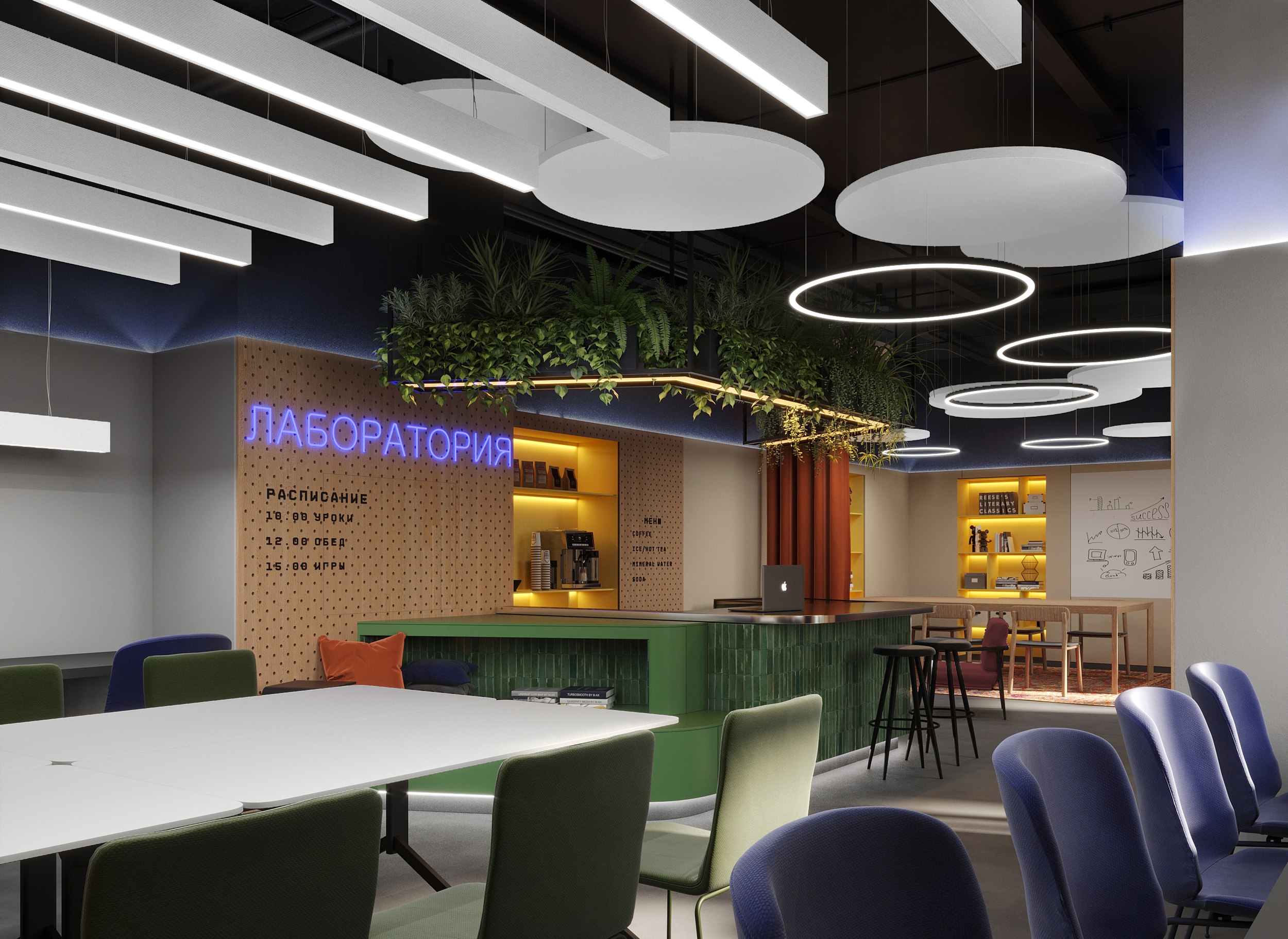 Общая концепция пространства построена по принципу активного офиса, потому что 90% времени дети обучаются онлайн, и единственное, что им требуется – подключение ноутбука к розетке и физическое рабочее место.