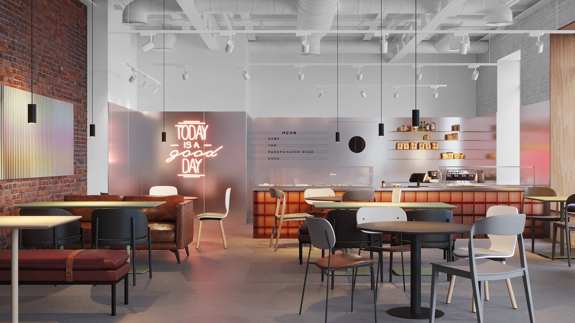 Общая узнаваемая черта всех размеров – неоновые вывески, работа со световыми сценариями и создание фальш-стен и фальш-полов (которые можно демонтировать при переезде и разместить в новом месте).