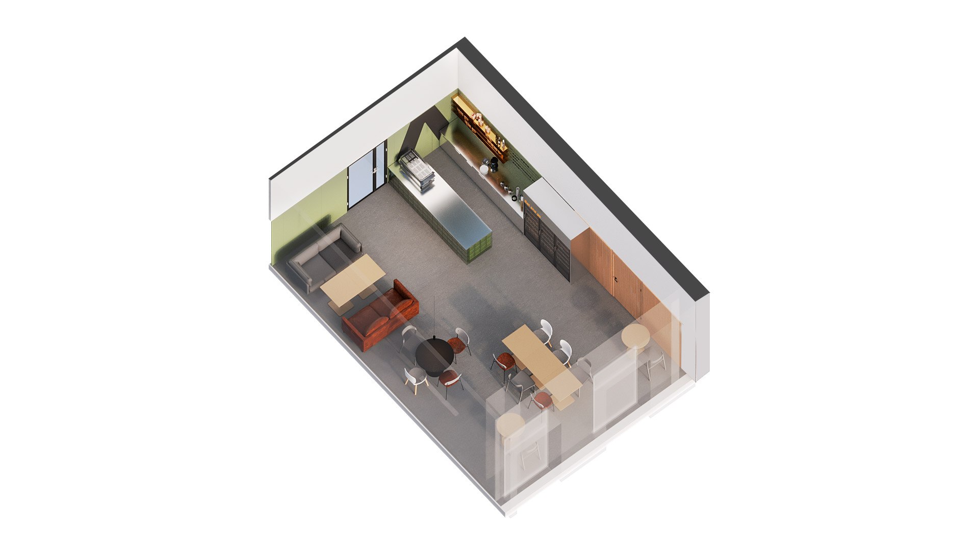 ● В размере L появляется столовая с пищеблоком, большее количество зон отдыха и разнообразие учебных и рабочих зон с несколькими вариантами отделки.