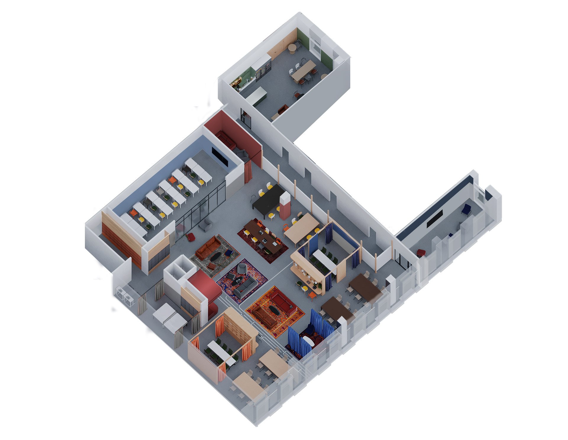 Особое внимание уделено базовым планировкам, чтобы создать звуковой комфорт для учащихся и развести громкие и тихие зоны.
