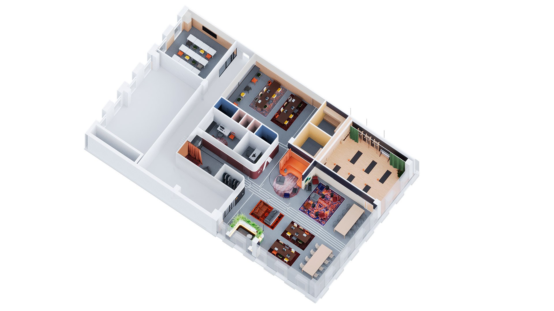 ● В размере M добавляются специализированные зоны в виде полноценного кафе, спортивного зала, совмещённого с залом для танцев, а также помещения для персонала, переговорные комнаты, отдельные классы, вендинговые автоматы, кабинеты врача и психолога.