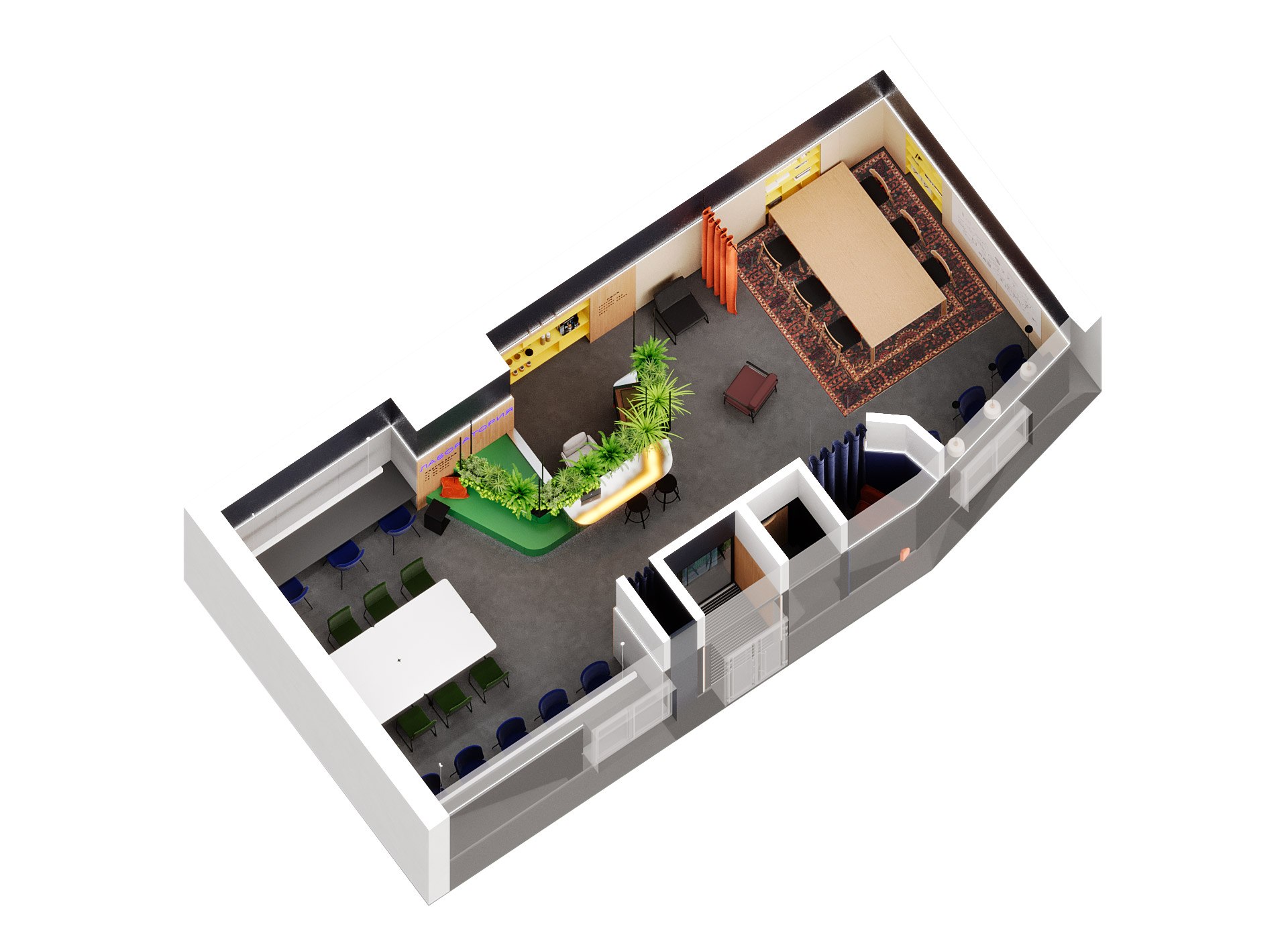 В основе концепции лежит представление о фракталах, что помогает в реализации как смыслового, так и пространственного компонентов проекта. Наши планировки разной размерности могут подстраиваться под разные условия, что позволит «Лаборатории» ускорить процесс поиска помещений и запуска работ проекта.